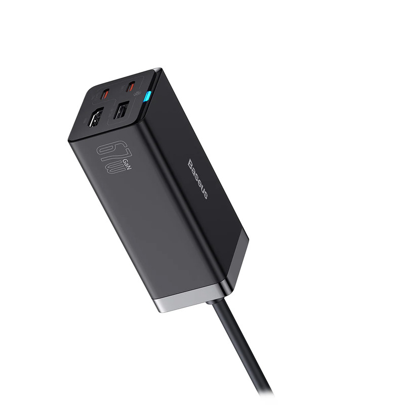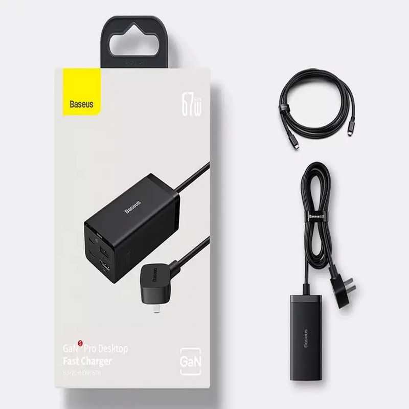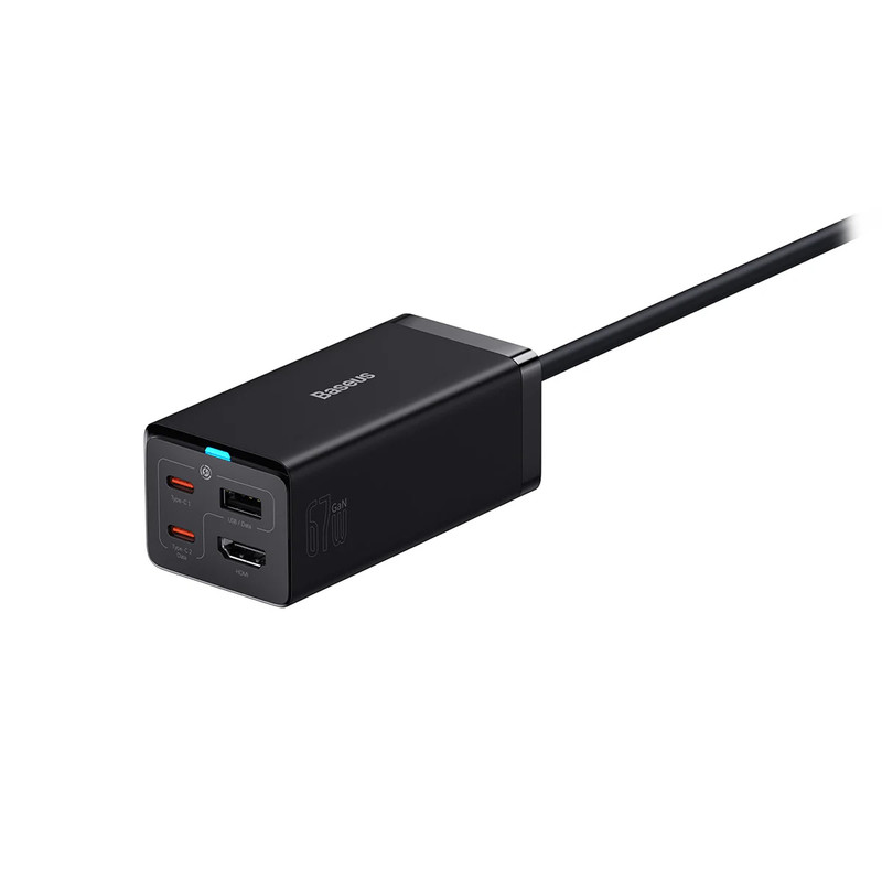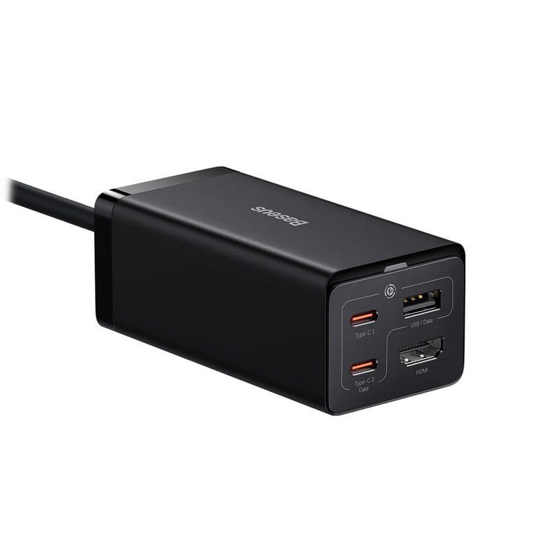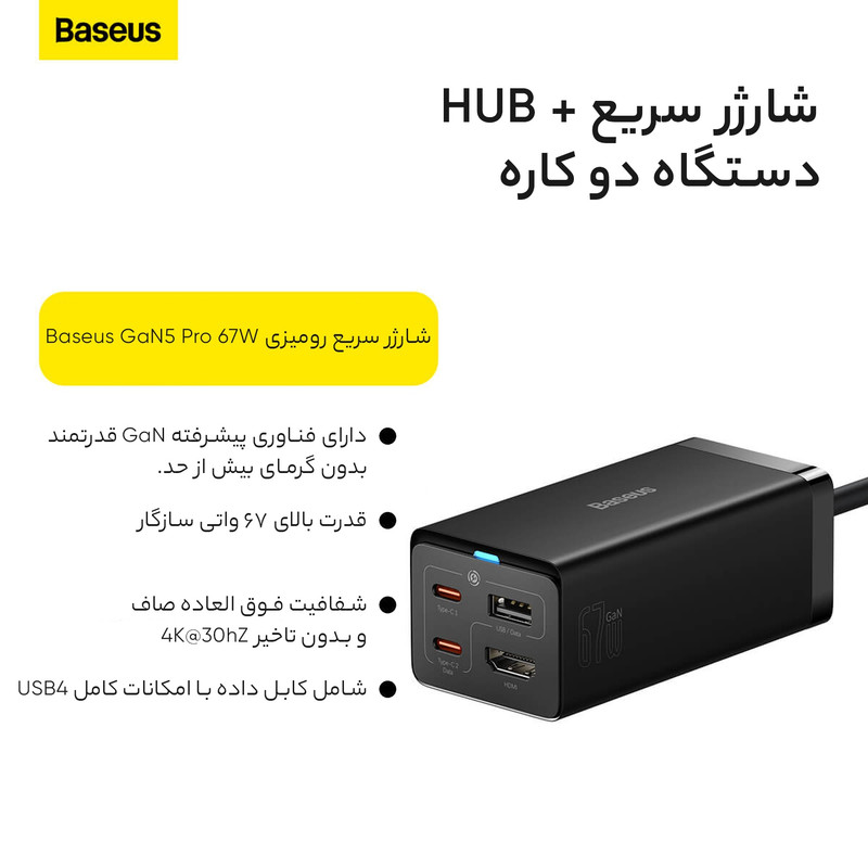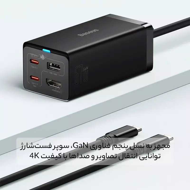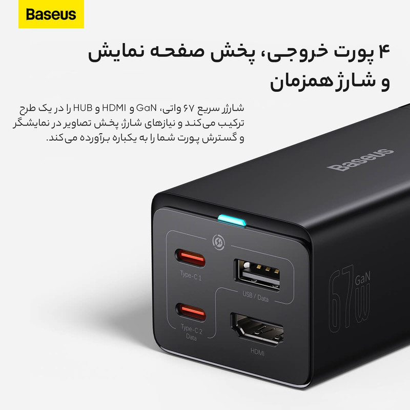 این محصول بدنهای از جنس پلیکربنات نسوز دارد که وزن آن تنها 288 گرم است و ابعادش 38×46×96 میلیمتر. برروی این بدنه، علاوهبر 4 درگاه متفاوت، یک نشانگر آبیرنگ دیده میشود که فعالیت دستگاه را به اطلاع شما خواهد رساند.شارژر و هاب 2 در 1 بیسوس محصولیست جمعوجور و کاملاً بیآزار! اول اینکه کابل 1.5 متری آن دارای یک برچسب است تا جمعآوری آن آسان باشد و احتمال صدمه دیدن یا دستوپاگیرشدنش کم، و دوم اینکه کانکتور آن را با زاویهای 45 درجه ساختهاند تا در هنگام نصب آن در کنار دوشاخههای دیگر دچار مشکل نشوید. این پلاگ از نوع AC است، با جریان ورودی شهری 100 تا 240گفتیم که 4 درگاه متفاوت برروی بدنهی این محصول بیسوس دیده میشوند: یک درگاه شارژ 67 واتی Type-C، یک درگاه شارژ و دیتای 67 واتی Type-C، یک درگاه USB شارژ و دیتا و یک درگاه HDMI. به لطف نسل دوم تکنولوژی شارژ BPS، شارژر و هاب بیسوس میتواند ولتاژ، شدتجریان و توان خروجی را بهطور هوشمند کنترل کند و بهگونهای تنظیم کندتا به دستگاه هاس مورد استفاده آسیب نرسد. با این تفاصیل، اگر بخواهید گوشی موبایل، تبلت و یا دیگر لوازم الکترونیکیتان را در یک زمان شارژ کنید، از درگاه Type-C1 این محصول تا 20 و از درگاه Type-C2 آن تا 45 وات توان خواهید گرفت. فناوری فوقالعادهی شارژر سریع، از شارژر و هاب بیسوس میتوان توقع داشت شارژدهی را بهصورت کاملاً ایمن انجام دهد.لازم به ذکر است که رنگ مشکی با کدCCGP110001 و رنگ سفید با کد CCGP110002 تولید شده است.