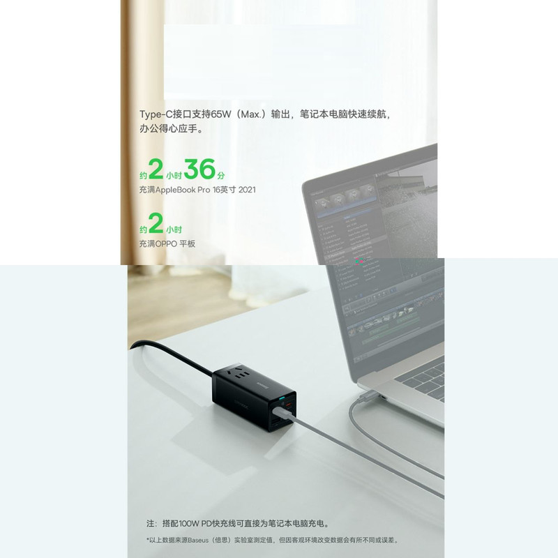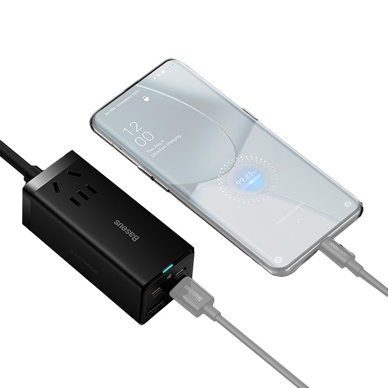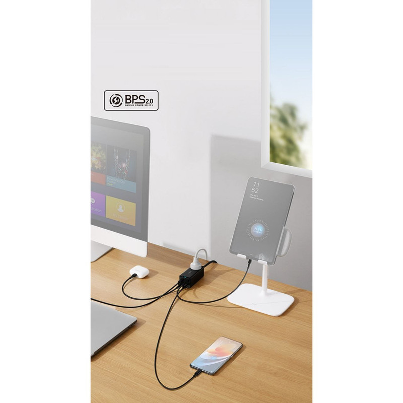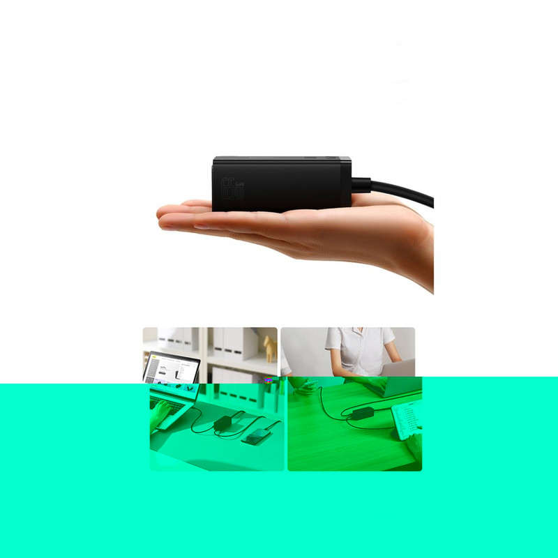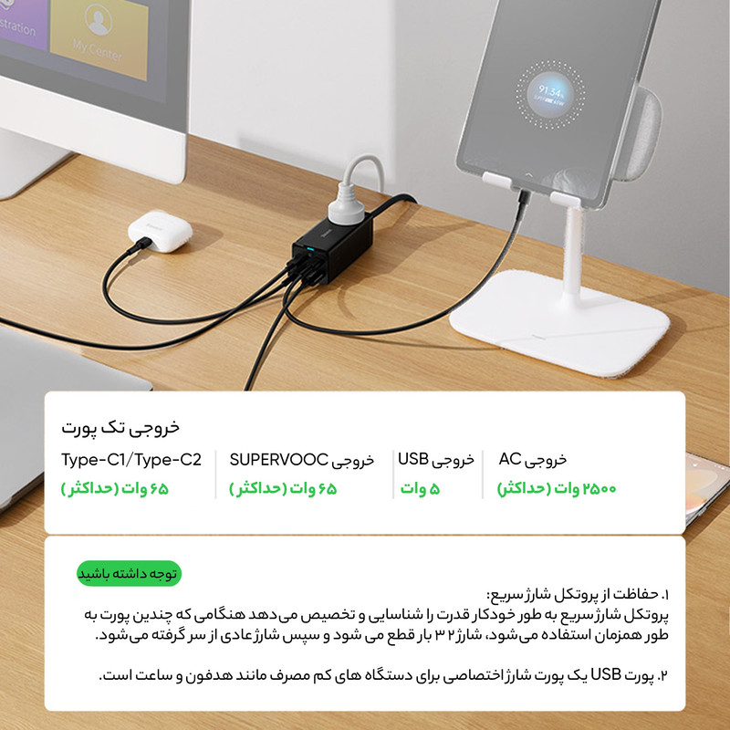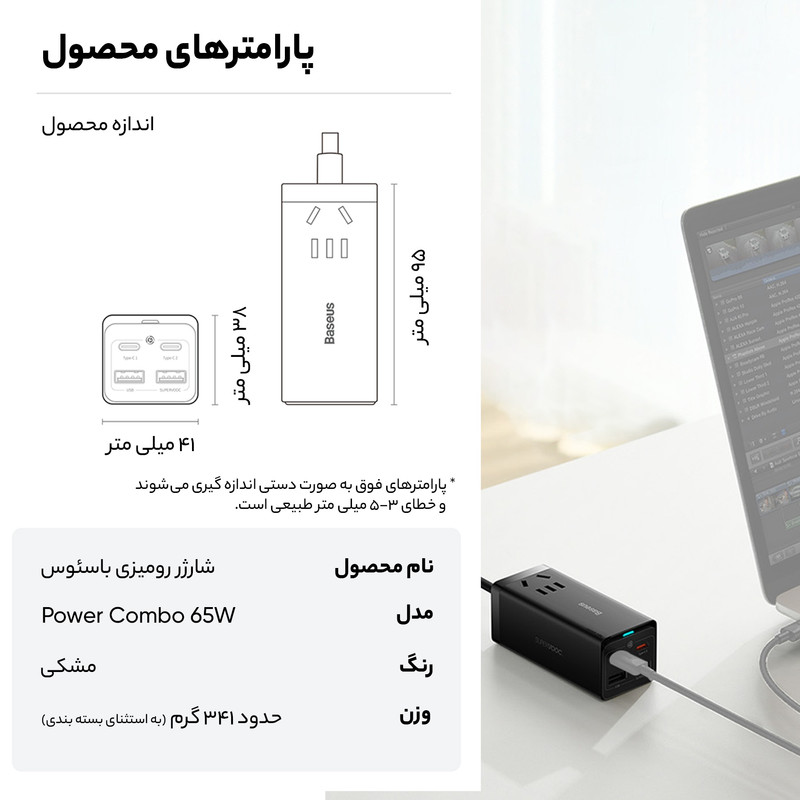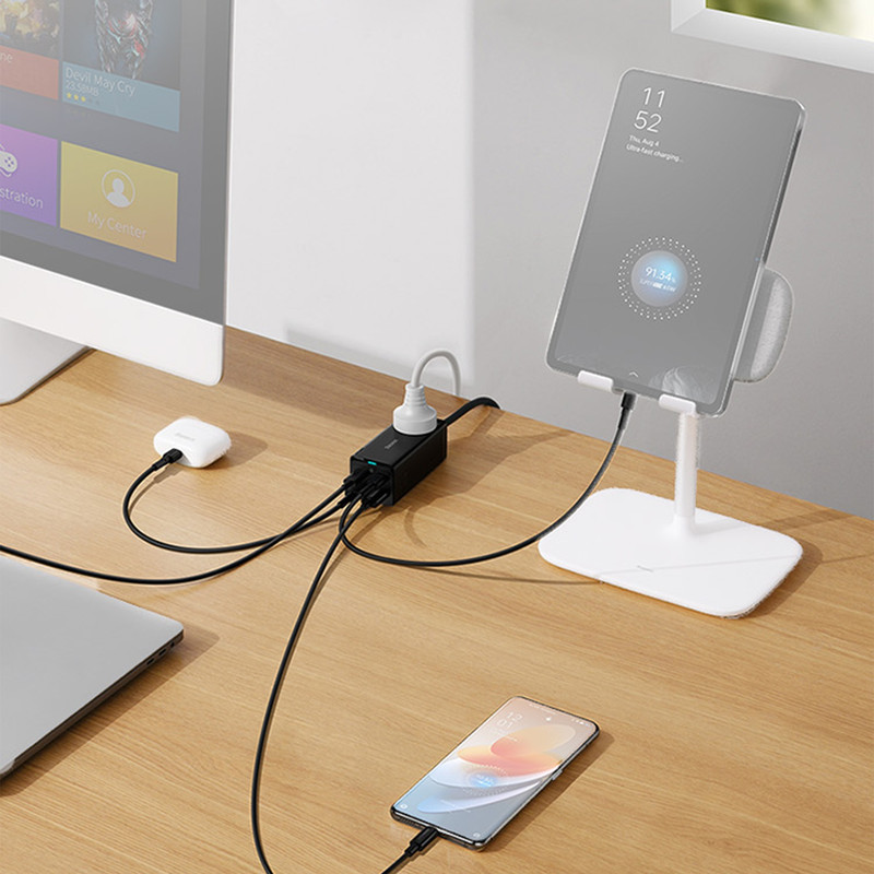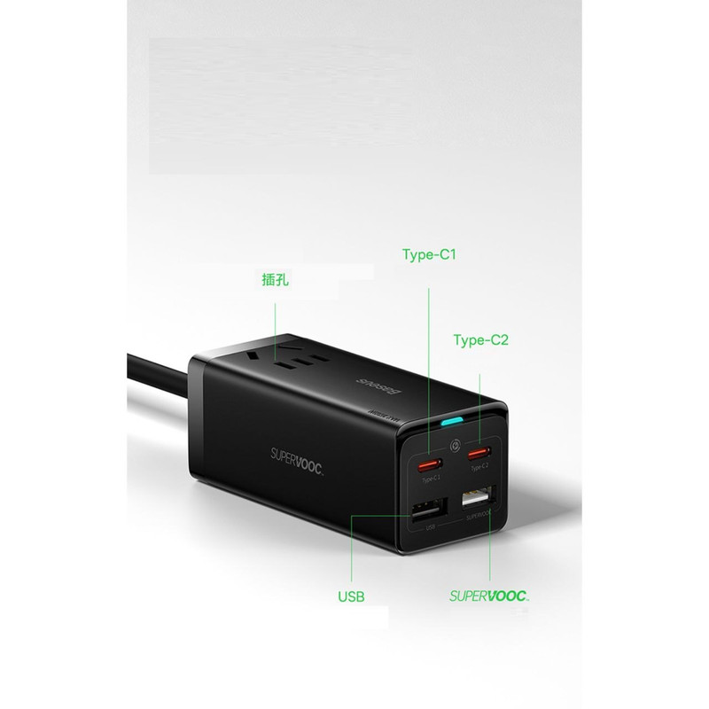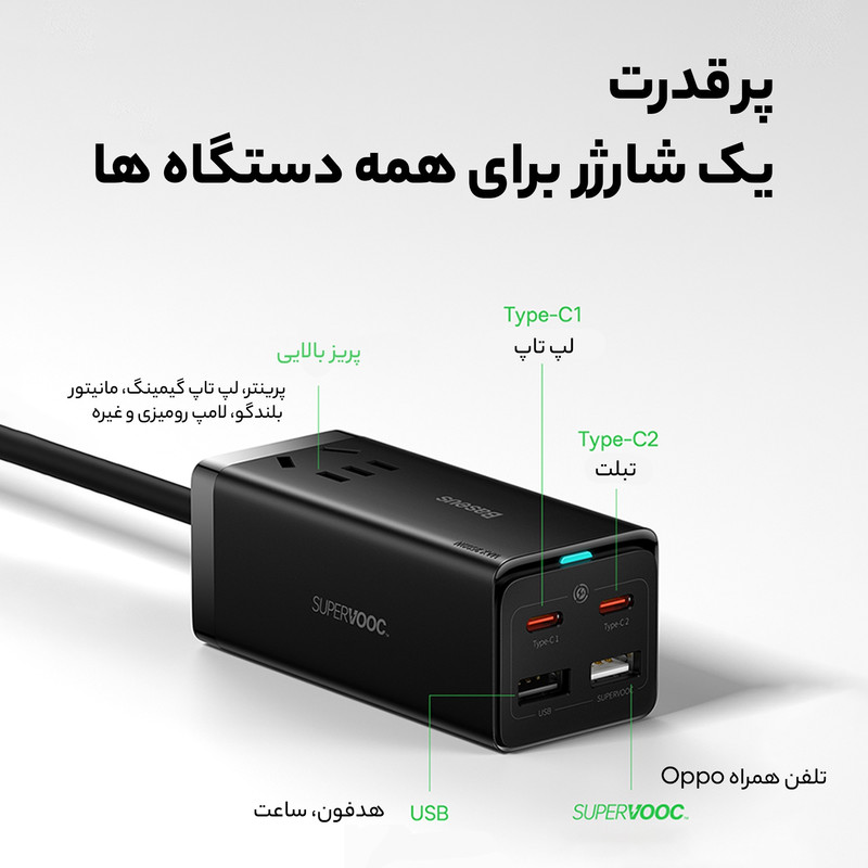 شارژر رومیزی 5 در 1 بیسوس Power Combo 65w با توان 65 وات این روزها که استفاده از تکنولوژی به یکی از مهمترین نیازهای بشر تبدیل شده است، لوازمهای برقی جایگاه ویژهای در زندگی همه پیدا کردهاند و پر بودن باتری آنها به یک دغدغه تبدیل شده است؛ خصوصا هنگامی که باتری آنها به صورت همزمان نیاز به دریافت انرژی داشته باشند. در چنین شرایطی نیاز به شارژری داریم که پاسخگوی تامین انرژی چند دستگاه به صورت همزمان باشد. به همین منظور کمپانی فعال بیسوس در عرصه تولید انواع شارژرهای فست، آداپتوری را طراحی کرده که با داشتن چهار پورت قادر به شارژ همزمان چهار دستگاه است. در ضمن از فناوری AC و DC به صورت همزمان بهرهمند است و شما میتوانید با توجه به این ویژگی نیروی برق یک دستگاه دیگر را هم تامین کنید. شارژر رومیزی Power Combo 65w بسیار کارآمدتر از یک شارژ استاندارد است و با توجه به جسه کوچک و ابعاد 95x41x38 میلیمتری که دارد از توان 65 وات برخوردار بوده و قادر به شارژ دستگاه شما در کوتاهترین زمان ممکن است. وزنی معادل 341 گرم داشته و به راحتی قابل حمل است. شارژر فست شارژ بیسوس قابل استفاده برای انواع برندها بوده و قادر به شارژ کامل باتری مکبوک پرو 16 اینچ 2019 در مدت 2 ساعت و بیست دقیقه، آیفون 12 حدود 2 ساعت و میت 40 پرو در مدت کوتاه 55 دقیقه است. در طراحی این شارژر دیواری بیسوس از فناوری گالیوم نیترید استفاده شده که دارای ویژگیهای پهنای باند بالا، رسانایی گرمایی زیاد، مقاومت گرمایی قابل توجه، مقاومت تابشی، مقاومت در برابر اسید و قدرت و استحکام بالا است.