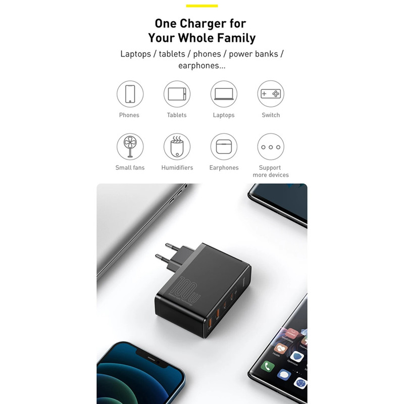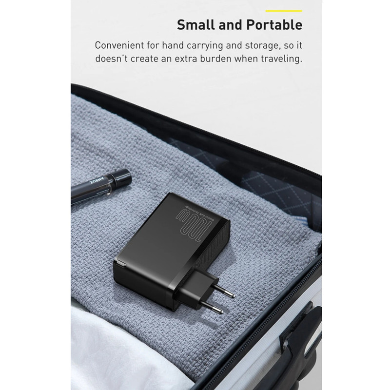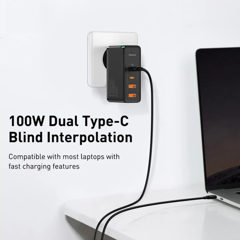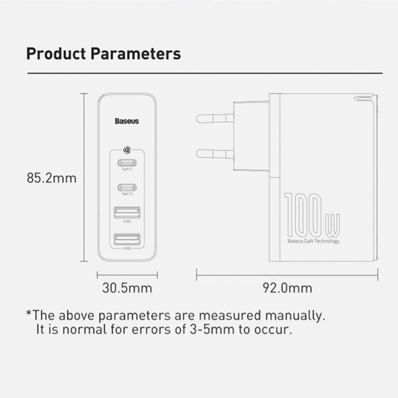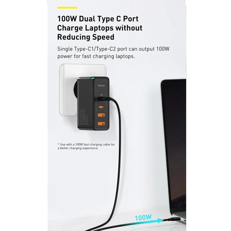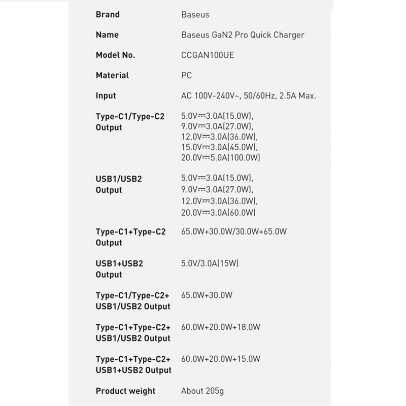 توان خروجی کلی آداپتور فست شارژ بیسوس CCGAN2P-L01 برابر با 100W بوده و ولتاژ ورودی آن برابر با 100-240V است.