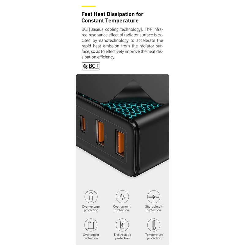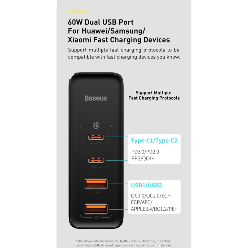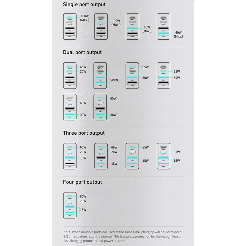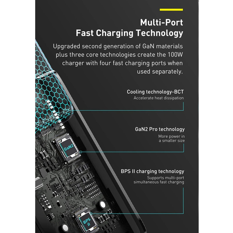 تکنولوژی Baseus Power Split II یا BPS II از نوآوری های شرکت بیسوس است که اجازه میدهد تا توان بین 4 پورت تقسیم شده و هر پورت آداپتور شارژ سریع بیسوس CCGAN2P-L01 بتواند با توان بالا دستگاهها را شارژ کنند.