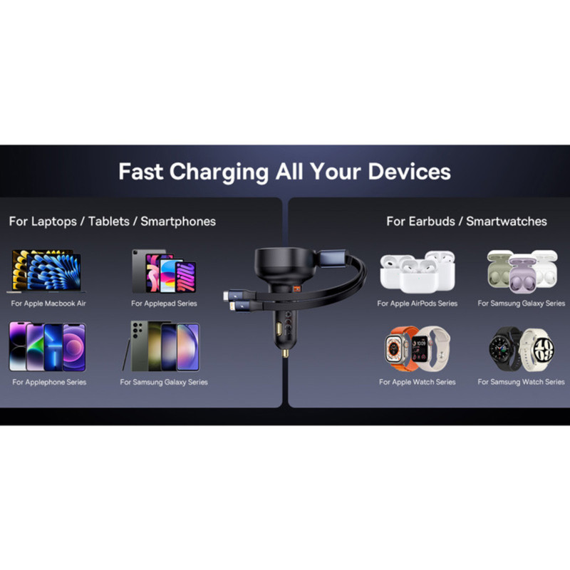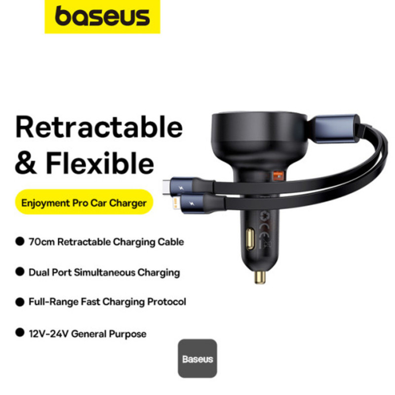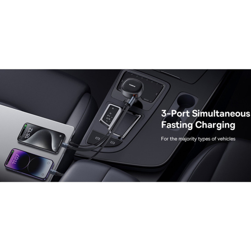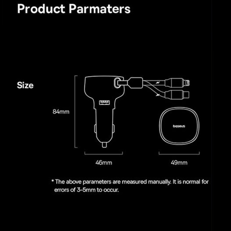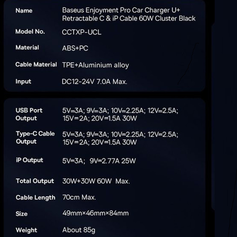 جنس بدنه ی شارژر فندکی Baseus CCTXP-UCL از ترکیبی از ABS و پلی کربنات ساخته شده که مقاومت بالایی به این محصول میبخشد. ابعاد این شارژر فندکی 84*46*49 میلی متر و وزن آن 85 گرم است. در نتیجه به راحتی میتوانید همراه خود آن را به هر جایی جابهجا کنید. روی بدنه شارژ فندکی بیسوس 1 پورت USB و همچنین یک کابل متصل Type-c و یک کابل متصل لایتنینگ تعبیه شده که می توانید به صورت تکی و یا همزمان از این دو خروجی استفاده کنید. در شارژر فندکی بیسوس CCTXP-UCL از رنگ مشکی براق استفاده شده که زیبایی خاصی به این محصول میبخشد.