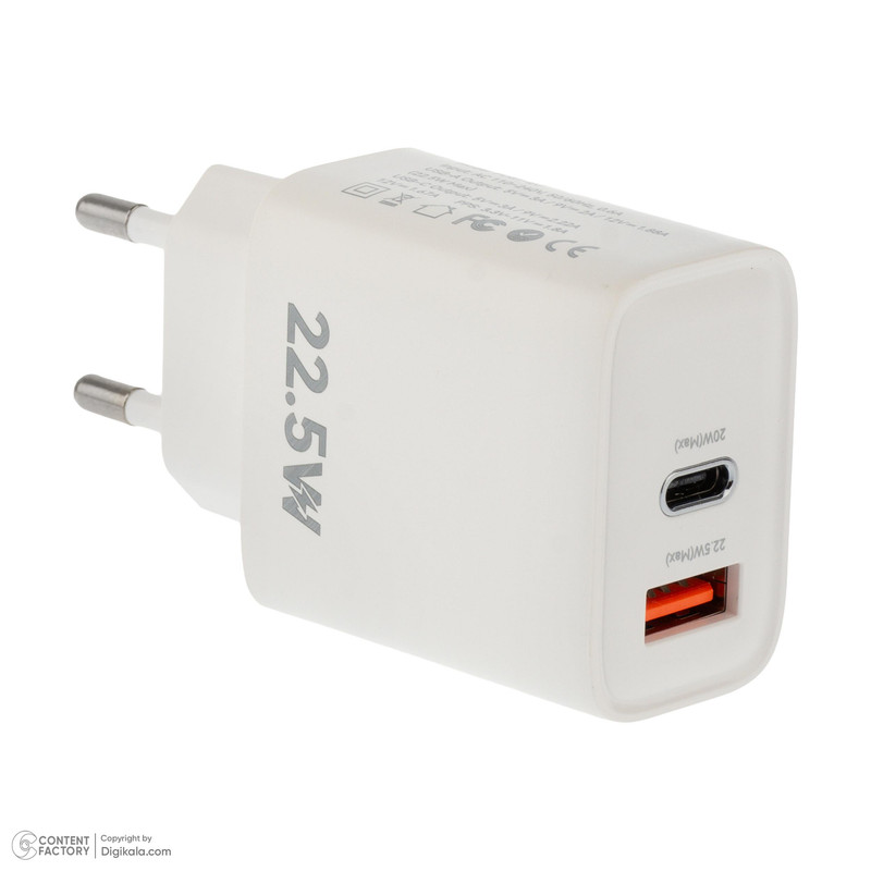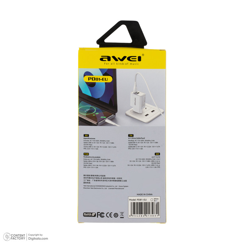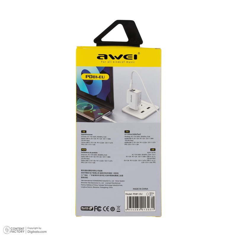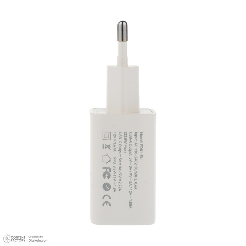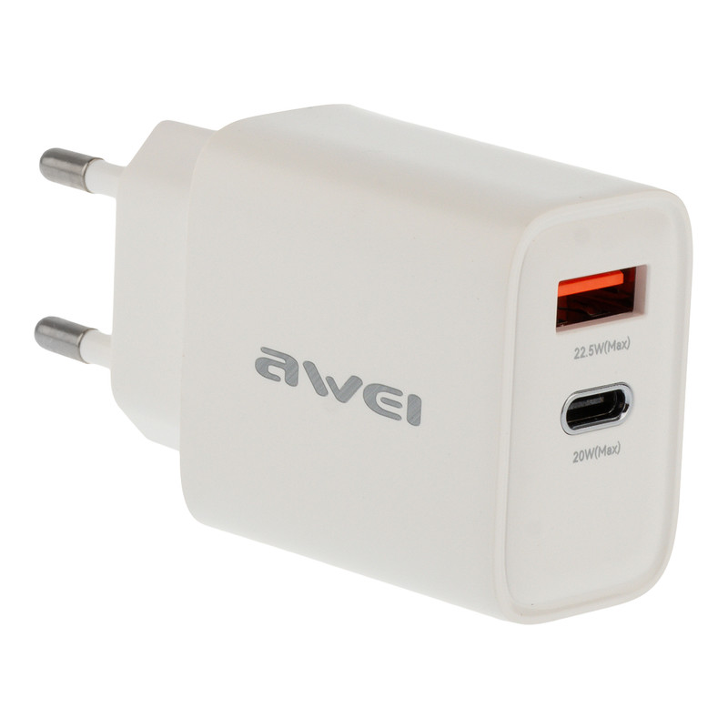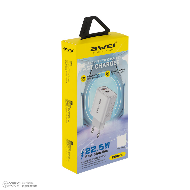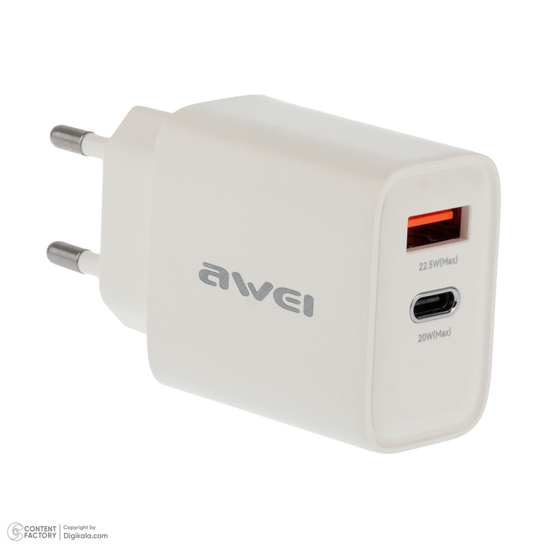 آداپتور شارژ سریع AWEI مدل PD81-EU دارای 2 پورت، یکی Type C و دیگری USB است که از پروتکل PD و QC و… نیز پشتیبانی میکند. همچنین اوی در طراحی این شارژر بر روی ابعاد شارژر جهت استفاده راحتتر هم مانور داده است . خروجی تایپ C این شارژر دارای توان حداکثر 20 وات و خروجی USB Type A آن دارای توان حداکثر 22.5 وات میباشد .