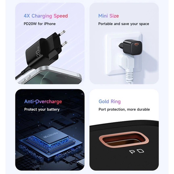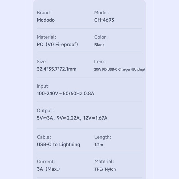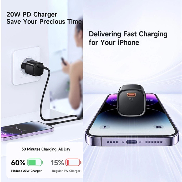 شارژر دیواری McDodo CH-4693 یک گزینه مناسب برای شارژ سریع و مطمئن دستگاههای هوشمند است و همراه با یک کابل Type-C به Lightning، نیاز کاربران آیفون را بهصورت کامل برطرف میکند. این شارژر با طراحی کوچک و وزن کم، بهراحتی در کیف یا جیب قرار میگیرد و برای استفاده در خانه، محل کار یا سفر کاملاً ایدهآل است. ابعاد 72.1×35.7×32.4 میلیمتری آن نشان میدهد که با وجود توان 20 وات، فضای بسیار کمی را اشغال میکند.