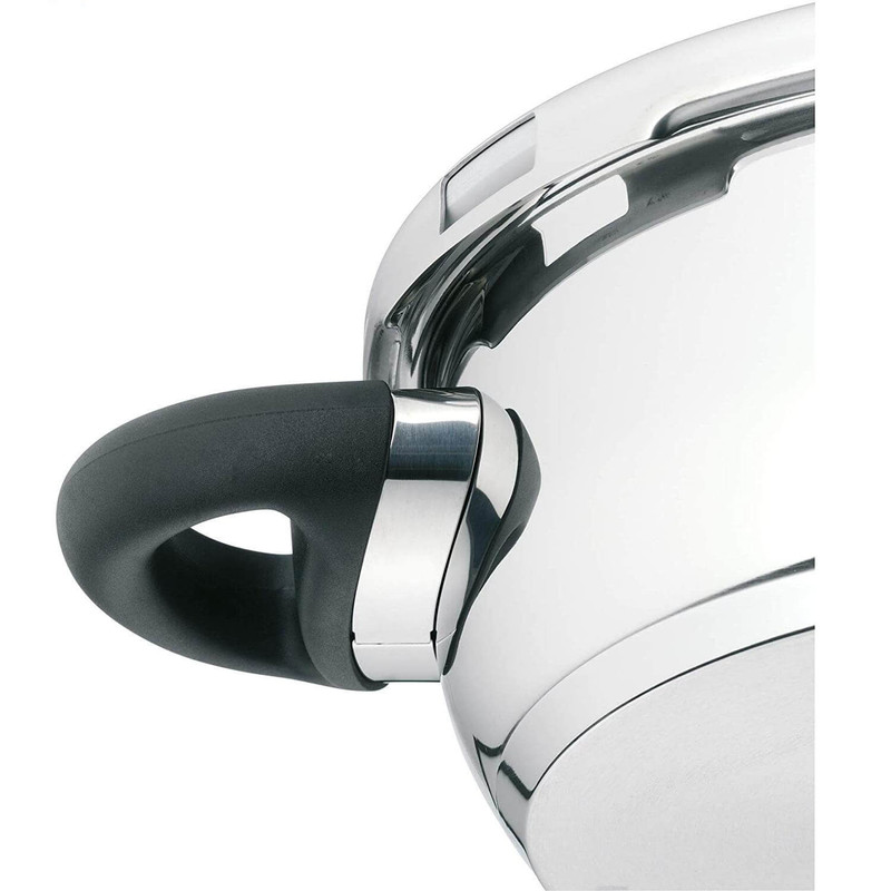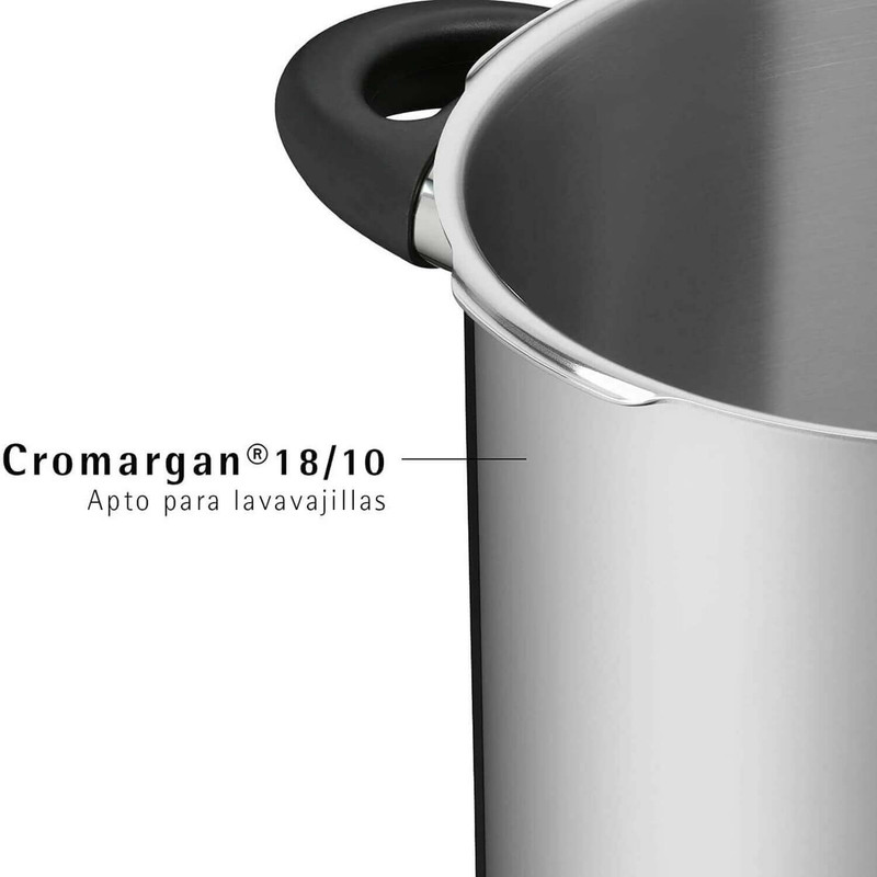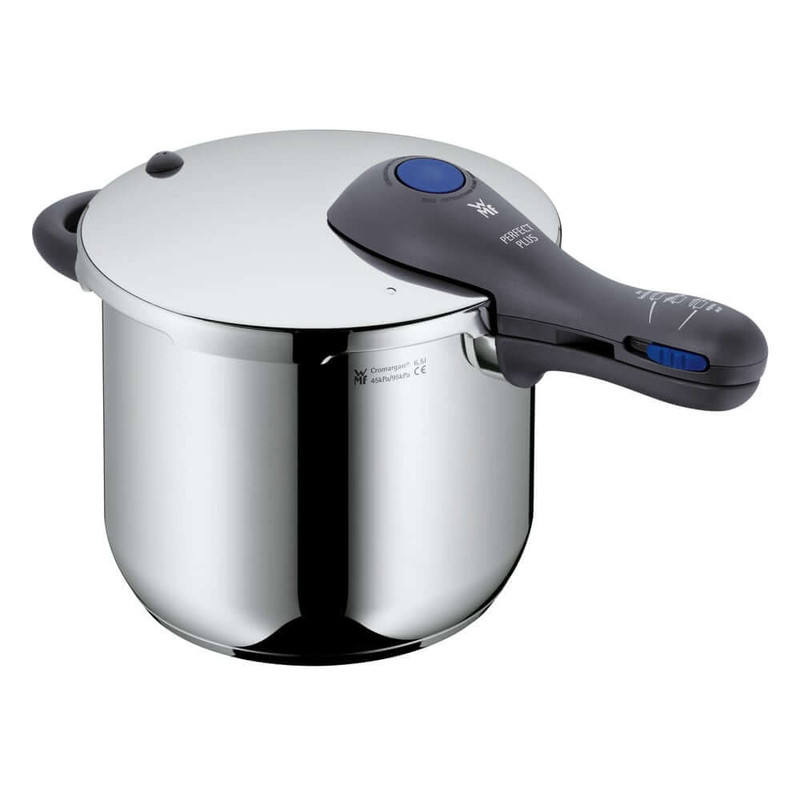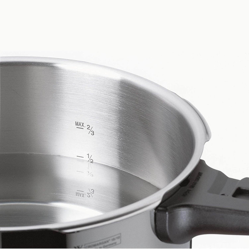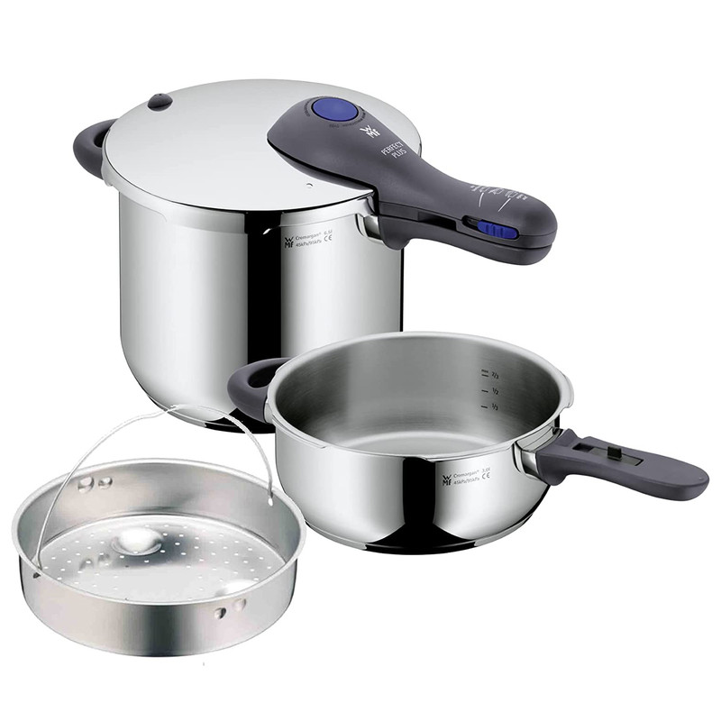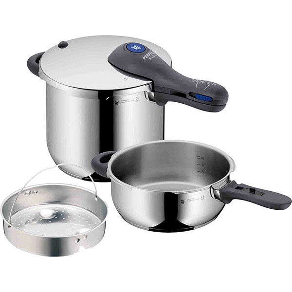 زودپز دوقلو WMF مدل Schnellkochtopf-Set 3-teilig Perfect Plus, 3L-6,5 L خروج خودکار بخار و ایمنی فشار باقی مانده برای باز شدن درب را فراهم می کند . این سرویس شامل یک زودپز 3 لیتر و یک زودپز 6.5 لیتر و سبد بخارپز و یک دسته همراه درب مشترک می باشد که داخل زودپز مقیاس اندازه گیری درج شده است تا آشپزی را راحت کند . نشانگر سازگاری با 2 کد رنگی برای تنظیم پخت و پز (110 درجه سانتیگراد/119 درجه سانتی گراد) . دسته درب قابل جدا شدن جهت نظافت ساده است . جنس فولاد ضد زنگ Cromargan ضد زنگ 18/10 قابل شستشو در ماشین ظرفشویی ، تمیز کردن آسان ، ایمن در فر ، بی مزه ( مزه غذا در این قابلمه ها تغییر نمی کند ) و مقاوم در برابر اسید می باشد . تهیه غذا در زودپز مدرن ، سریع و سالم است . فشار شدید و دمای بالا ، زمان پخت معمولی را تا 70 درصد کوتاه می کند . با صرفه جویی همزمان انرژی در حدود 50 درصد از ویتامین ها ، مواد مغذی و مواد معدنی تا حد زیادی با پخت ملایم حفظ می شوند و غذاها مقوی و خوشمزه هستند . قابلمه های پرسرعت تقریباً برای تهیه همه غذاها و سبزیجات ، گوشت و ماهی ، غلات و حبوبات ، سوپ ها و خورش ها مناسب هستند . طراحی کلاسیک آن جاودانه است و عملکرد آن همیشه با جدیدترین فناوری مطابقت دارد .