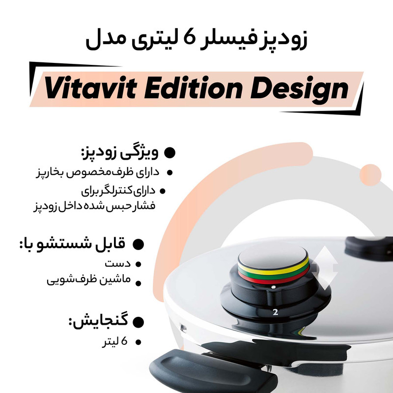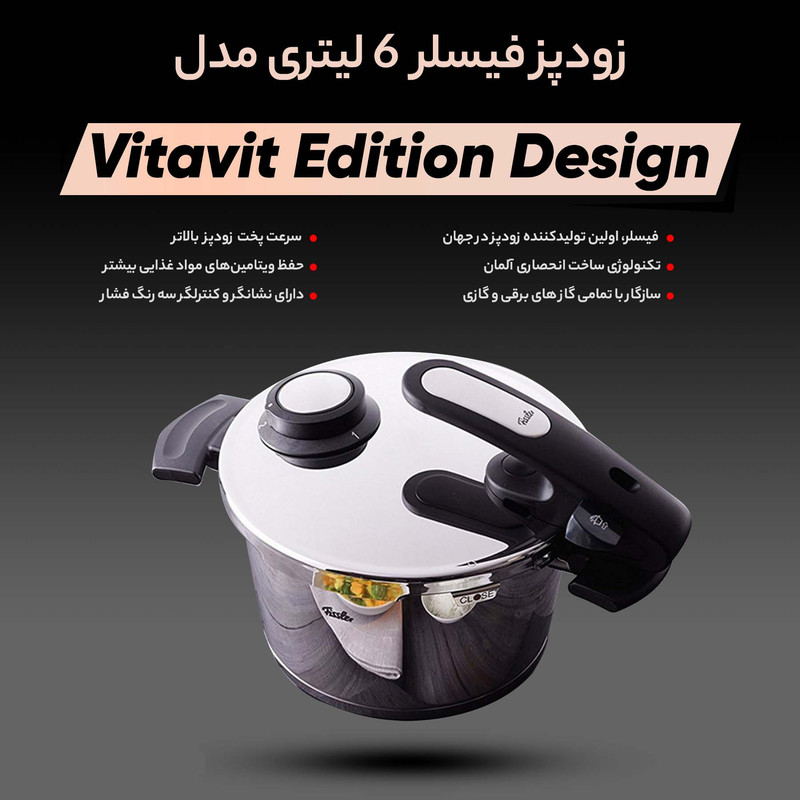 فیسلر به عنوان اولین تولیدکننده زودپز، 170 سال پیش (1845) توسط کارل فیلیپ فیسلر در آلمان پایه گذاری شد. «زودپز فیسلر مدل Vitavit Edition Design - گنجایش 6 لیتر» یکی از مدلهای سری ویتاویت است که طراحی زیبایی دارد .زودپز فیسلر جزو یکی از امنترین زودپزهای تولیدشده در سراسر جهان است. حجم فشار تولیدشده در این زودپز 150 کیلو پاسکال بوده که در مقایسه با زودپزهای معتبر دیگر بیشتر است. از این رو سرعت پخت در زودپز فیسلر بالاتر از سرعت پخت در زودپزهای دیگر است. پس میتوان نتیجه گرفت که زمان کمتری از شما گرفته خواهد شد و هرچه قدر سرعت پخت بالاتر باشد ویتامینهای مواد غذایی بیشتر حفظ خواهد شد. این زودپز با تمامی انواع گازها، مانند گازهای الکتریکی یا گازی سازگاری دارد. این دستگاه بهطور معمول بدون فشار نیز کار میکند و میتوانید در مواقع دلخواه در آن را به منظور همزدن یا اضافه کردن موادغذایی بردارید و به همه روند پختوپز احاطه داشته باشید. بر روی درزودپز انتخابگری وجود دارد که میتوانید میزان فشار حبس شده داخل زودپز را کنترل نمایید بدینصورت که مطابق دفترچهراهنما برای یکسری از موادغذایی بر روی قسمت 1 و برای موادغذایی دیگر بر روی قسمت 2 قابل تنظیم خواهد بود. همچنین این انتخابگر به شما این امکان را میدهد تا بعد از اتمام پخت بخار حبسشده در زودپز را به راحتی تخلیه نمایید. این زودپز از استیل 10/18 ساختهشده که بهترین و مرغوبترین کیفیتاستیل را دارد. دستگیره این مدل، جوری طراحی شده تا جایکمتری را اشغال کند. داخل زودپز مندرج شده است تا شما بدوننیاز به لیوان یا کاسهمندرج، مقدار مواد یا آب موردنظر خود را به داخل ظرف اضافه کنید. در این مدل از زودپز فیسلر مراحل پخت به صورت خطوط رنگی (زرد – سبز – قرمز) مشخص شده است که این امکان را به کاربر میدهد که در صورت لزوم میزان حرارت زیر زودپز را تغییر دهید. «زودپز فیسلر مدل Vitavit Edition Design - گنجایش 6 لیتر» دارای ظرفمخصوص بخارپز است که شما میتوانید با استفاده از آن، انواع سبزیجات و مواد خوراکی دیگر را هم بخارپز نمایید. در مجموع این دستگاه با قیمت مناسب و کاربرد های ویژه آن، بسیار مقرون به صرفه و اقتصادی برای مصارف خانگی است.