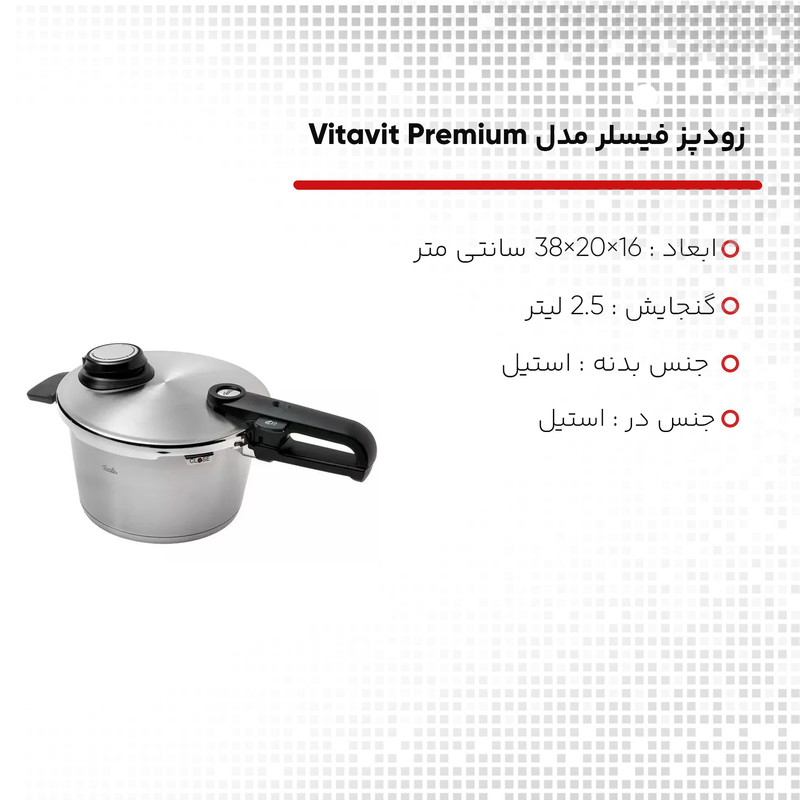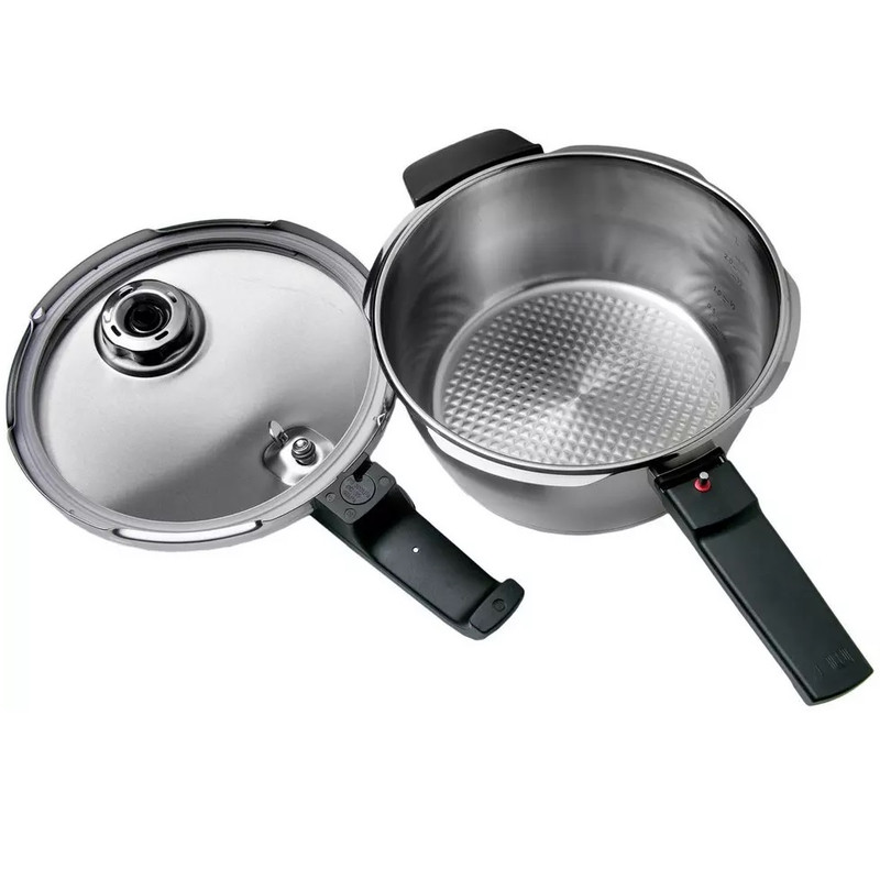 ساخته شده از استیل 18/10، گنجایش 2.5 لیتر،قابلیت استفاده با کمترین میزان آب جهت پخت حجم کم مواد غذایی، کف چدنی، کفه دارای سیستم پخش یکنواخت حرارت، دارای چهار سوپاپ ایمنی، سوپاپ نمایشگر حجم بخار داخلی،سوپاپ با قابلیت تنظیم حجم بخار داخلی در سه درجه پخت بهمراه حالت خروجی بخار، دسته و سوپاپ بطور کامل جداشو قابل و شستشو، تنها زودپز موجود در بازار که قابلیت تحمل بخار تا حجم 150 کیلو پاسکال را داراست، دارای سبد و پایه بخارپز جهت پخت بخارپزی سریع مواد غذایی، واشر و سوپاپ از جنس سیلیکونی با طول عمر بالا، ساخت کشور آلمان