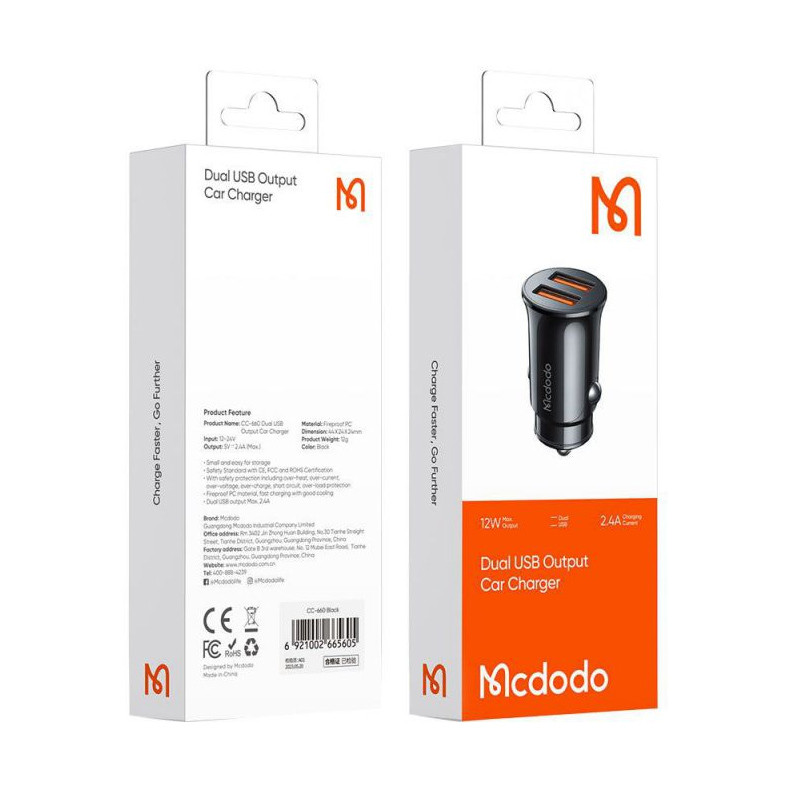 شارژر فندکی 12 وات مک دودو مدل CC-660 با داشتن 2 پورت خروجی، از شارژ همزمان دو گوشی پشتیبانی می کند و کاربران می توانند به راحتی از هر دو پورت USB آن استفاده کنند. ماکزیمم جریان خروجی در این شارژر فندکی برابر با 5V/2.4A است، که بهره وری عالی را تضمین می کند. با به همراه داشتن شارژر فندکی 12 وات مک دودو مدل CC-660 دیگر در مسیر های طولانی نگران خاموش شدن گوشی همراهتان نخواهید بود زیرا می توانید به راحتی گوشی خود را با استفاده از آن در اتومبیل شارژ کنید.