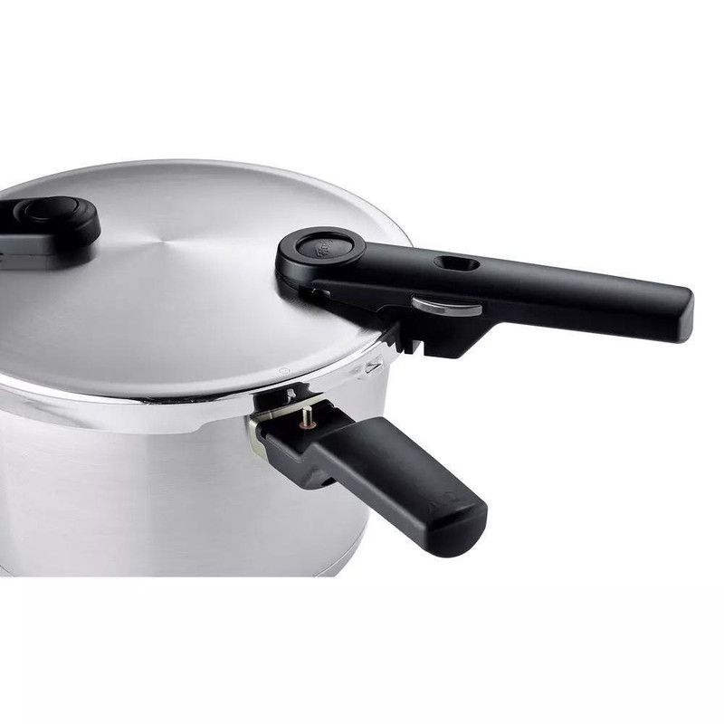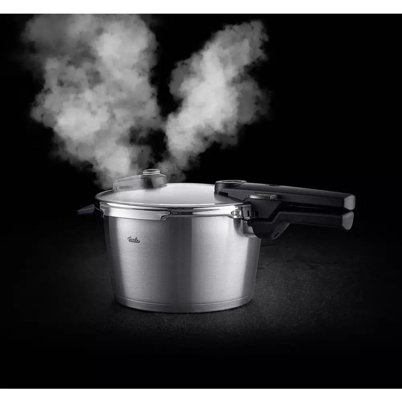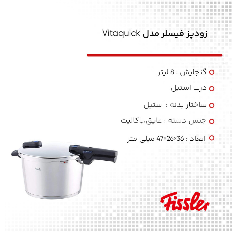 فیسلر به عنوان اولین تولیدکننده زودپز، 170 سال پیش (1845) توسط کارل فیلیپ فیسلر در آلمان پایه گذاری شد. «زودپز فیسلر مدل Vitaquick – گنجایش 8 لیتر» یکی از مدلهایی است که طراحی زیبایی دارد .زودپز فیسلر جزو یکی از امنترین زودپزهای تولیدشده در سراسر جهان است. حجم فشار تولیدشده در این زودپز 150 کیلو پاسکال بوده که در مقایسه با زودپزهای معتبر دیگر بیشتر است. از این رو سرعت پخت در زودپز فیسلر بالاتر از سرعت پخت در زودپزهای دیگر است. پس میتوان نتیجه گرفت که زمان کمتری از شما گرفته خواهد شد و هرچه قدر سرعت پخت بالاتر باشد ویتامینهای مواد غذایی بیشتر حفظ خواهد شد. این زودپز با تمامی انواع گازها، مانند گازهای الکتریکی یا گازی سازگاری دارد. این دستگاه بهطور معمول بدون فشار نیز کار میکند و میتوانید در مواقع دلخواه در آن را به منظور همزدن یا اضافه کردن موادغذایی بردارید و به همه روند پختوپز احاطه داشته باشید. این زودپز از استیل 10/18 ساختهشده که بهترین و مرغوبترین کیفیتاستیل را دارد. داخل زودپز مندرج شده است تا شما بدوننیاز به لیوان یا کاسهمندرج، مقدار مواد یا آب موردنظر خود را به داخل ظرف اضافه کنید. دارای 2 انتخابگر برای سرعت پخت و پز است که به وسیله دکمه روی دستگاه قابل تغییر است. دسته آن به آسانی جدا شده و به آسانی قابل پاکسازی است. همچنین کف این زودپز فوق حرارتی است و توانایی تحمل دماهای بالا را دارد. در مجموع «زودپز فیسلر مدل Vitaquick – گنجایش 8 لیتر» با قیمت مناسب و کاربردهای ویژه آن، بسیار مقرون بهصرفه و اقتصادی برای مصارف خانگی است.