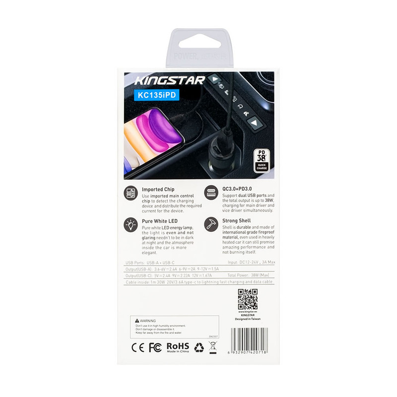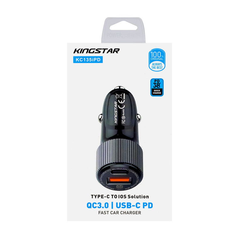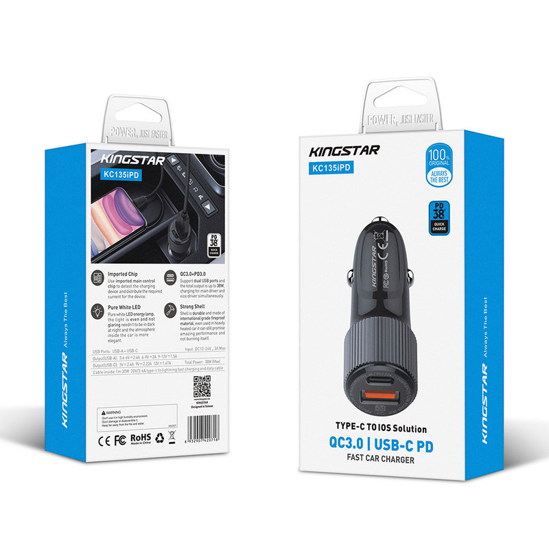 شارژر فندکی KC135i PD از جدید ترین محصولات برند کینگ استار با توان خروجی 38 واتی است که با استفاده از فناوری به روز PD و QC3.0 سرعت و کیفیت شارژدهی مناسبی را در اختیار استفاده کنندگان از این محصول قرار میدهد. دو درگاه خروجی Type-C و USB روی بدنه و همچنین لامپ LED از ویژگی های ظاهری این شارژر میباشد. برای هر دستگاه موبایلی از این شارژر میتوانید استفاده کنید چرا که با استفاده از چیپ های هوشمند، جریان ورودی دستگاه شما کنترل و متناسب سازی شده تا بر خلاف تصور عموم، آسیبی به باتری دستگاه شما نرسد. استفاده از مواد باکیفیت در ساخت قطعات باعث شده تا با وجود حرارت خودرو و داغ شدن احتمالی شارژر های فندکی، این محصول کارایی خود را در دماهای بالاتر نیز حفظ کند. در بسته بندی محصول نیز یک کابل Type-C به lightning با توان 30 وات قرار داده شده است.