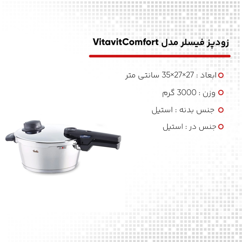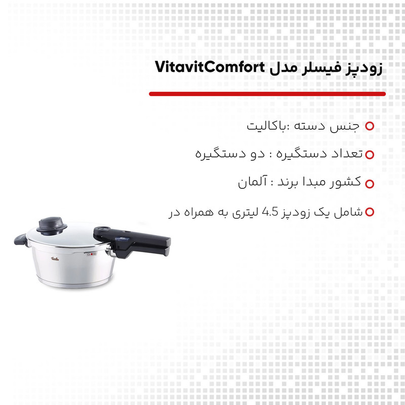 شرکت فیسلر آلمان در سال 1845 تاسیس شد و تا کنون محصولات با کیفیت بسیار بالا در حوزه آشپزخانه را تولید می کند. زودپز فیسلر از معروفترین محصولات این کمپانی می باشد که از لحاظ امنیت و کیفیت پخت غذا بالاترین استاندارد های ممکن را دارد. این محصول با داشتن نشانگر رنگی میزان فشار بخار را نمایش می دهد. این زودپز در نهایت سکوت و بدون کم کردن آب، غذا را در سریعترین زمان ممکن می پزد.شما با استفاده از این محصول می توانید تا 70 درصد در زمان پخت صرفه جویی نمایید. کلیه اجزای این محصول قابلیت نظافت دارد.