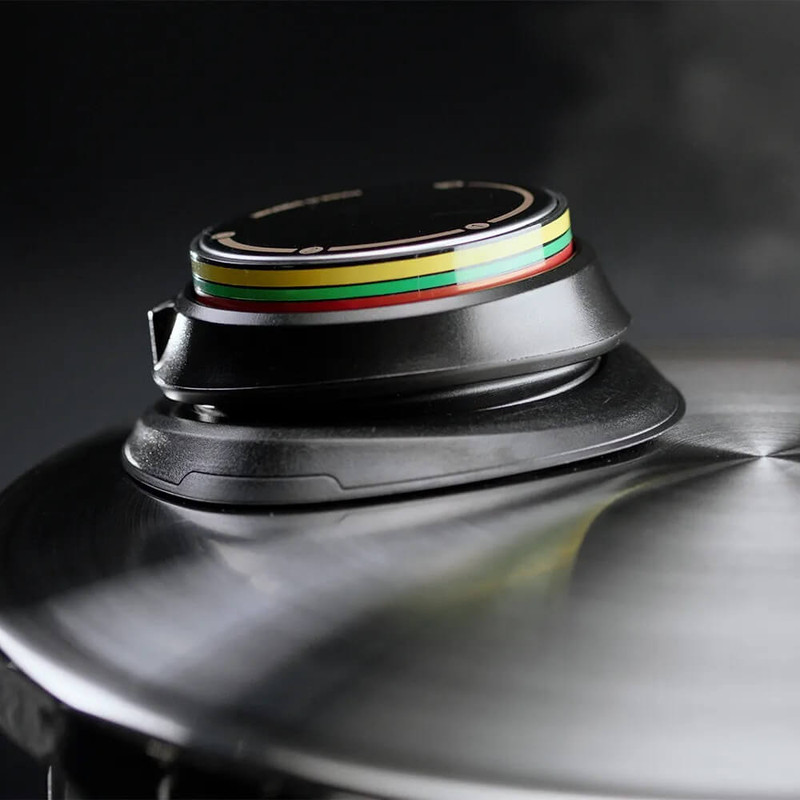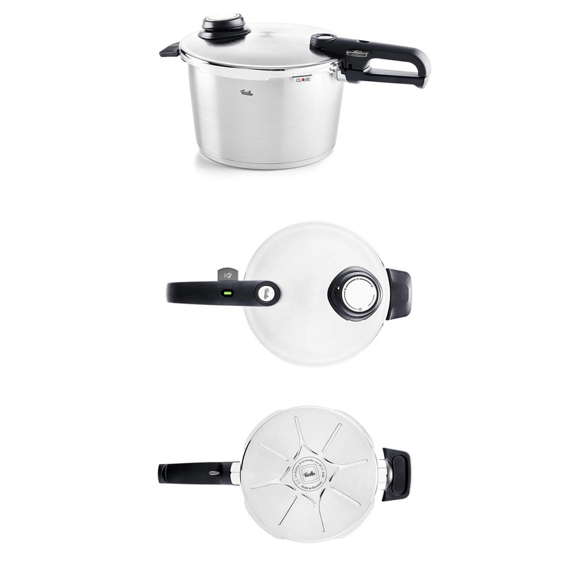 در زودپز های فیسلر تکنولوژی پیشرفته زیادی وجود دارد که کار با آن را آسان و راحت می کند تا از آشپزی لذت ببرید . با استفاده از تکنولوژی پیشرفته امنیتی ، هیچ چیز نمی تواند به اشتباه برسد . تا 70٪ از زمان پخت و پز را کاهش می دهد و این کار باعث می شود ویتامین ها و مواد معدنی تا حد زیادی حفظ شود . اگر درب به درستی بسته شده باشد صدای “کلیک” شنیده می شود و یک صفحه نمایش رنگی در دسته از قرمز به سبز تغییر می کند . 2 درجه روی درب برای پخت مواد دیرپز و زودپز روی درب قرار دارد مرحله 1 برای غذاهای حساس مانند سبزیجات یا ماهی و مرحله 2 پخت و پز سریع برای گوشت و خورشت است . نشانگر روی درب مانند چراغ راهنمایی باعث می شود آشپزی با زودپز کاملا بی خطر باشد . زرد : در حال پختن است . سبز : دمای تنظیم شده رسیده است و زمان پخت و پز آغاز می شود . قرمز: درجه حرارت خیلی زیاد است و فشار بالایی در دیگ جمع شده و باید شعله کم شود . دارای درجه بندی در داخل دیگ از کم تا زیاد .