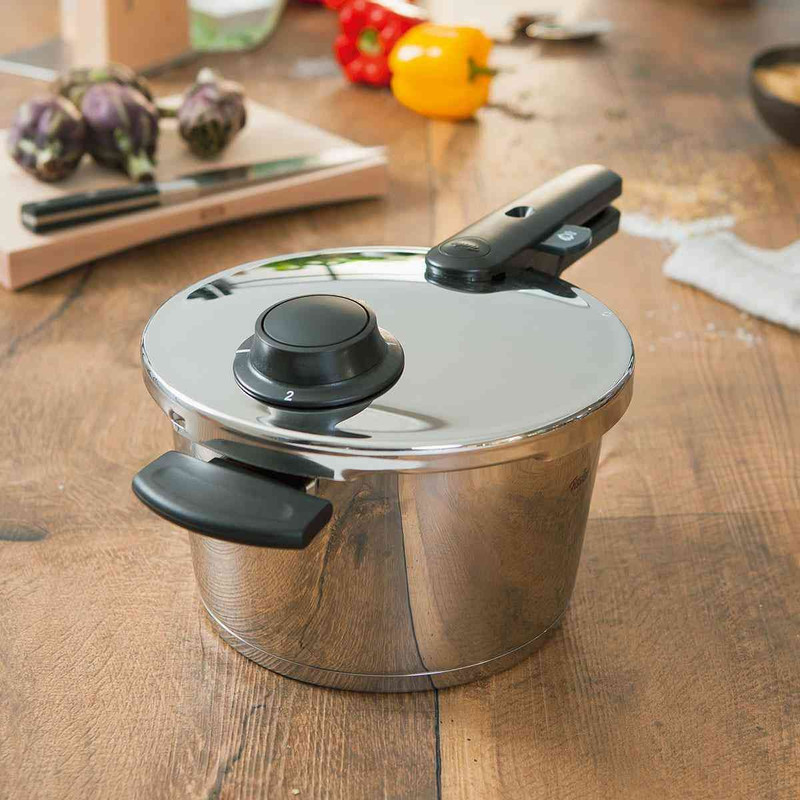 فیسلر به عنوان ،اولین تولید کننده زودپز، 170 سال پیش (۱۸۴۵) توسط کارل فیلیپ فیسلر در آلمان پایه گذاری شد. تجارت خانوادگی او از سالها پیش تاکنون ادامه یافته و در حال حاضر در هفتاد کشور دنیا نمایندگی دارد .جالب است بدانید در دنیا هر سه ثانیه یکبار یک محصول از برند جهانی فیسلر خریداری میشود. «زودپز فیسلر مدل VitavitComfort - گنجایش 4.5 لیتر» یکی از مدلهای سری ویتاویت کامفورت است که با طراحی زیبا و امنیت بسیار بالا توسط این شرکت تولید شده است و گنجایش بسیار زیاد برای انواع مواد غذایی را دارا می باشد . همانطور که میدانید امنیت کار با دستگاه زودپز مساله بسیار مهمی است که در تمام دنیا مصرفکنندگان به عنوان یک پارامتر مهم درنظر میگیرند. زودپز فیسلر جزو یکی از امنترین زودپزهای تولید شده در سراسر جهان است که با تجربهای حدود 170 سال تولید لوازم خانه و آشپزخانه خیال هر کاربری را از استفاده از زودپز راحت کرده است. حجم فشار تولید شده در این زودپز 150 کیلو پاسکال بوده که در مقایسه با زودپزهای معتبر دیگر بیشتر است؛ از این رو سرعت پخت در زودپز فیسلر بالاتر از سرعت پخت در زودپزهای دیگر است. پس میتوان نتیجه گرفت که زمان کمتری از شما گرفته خواهد شد و هرچه قدر سرعت پخت بالاتر باشد ویتامینهای مواد غذایی بیشتر حفظ خواهد شد. بر روی در زودپز انتخابگری وجود دارد که میتوانید میزان فشار حبس شده داخل زودپز را کنترل نمایید بدین صورت که مطابق دفترچه راهنما برای یک سری از مواد غذایی بر روی قسمت 1 و برای مواد غذایی دیگر بر روی قسمت 2 قابل تنظیم خواهد بود. این زودپز از استیل 18/10 ساخته شده که بهترین و مرغوبترین کیفیت استیل را دارد. در این مدل از زودپز فیسلر مراحل پخت به صورت خطوط رنگی (زرد – سبز – قرمز) مشخص شده است که این امکان را به کاربر میدهد که در صورت لزوم میزان حرارت زیر زودپز را تغییر دهد.