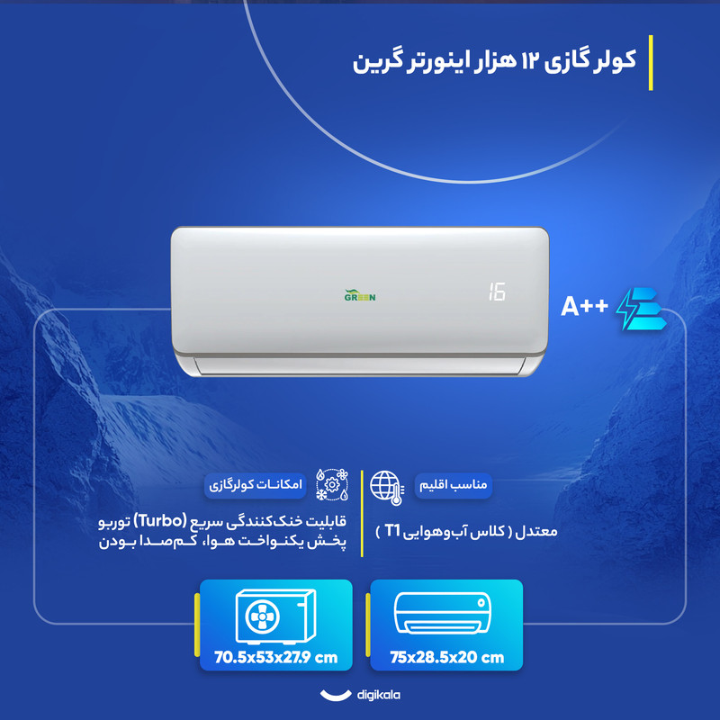 کولر گازی اسپلیت دیواری 12000 اینورتر گرین مدل SDK‑CH12F1C1A2P یک انتخاب کارآمد برای فضاهای کوچک و متوسط است و با عملکرد سرمایش و گرمایش، امکان استفاده در تمام فصول را فراهم میکند. بهرهمندی از رده انرژی A++ و توان مصرفی ۱۲۵۰ وات، دستگاه را به گزینهای بهینه و کممصرف تبدیل میکند. کمپرسور روتاری با برد اینورتر موجب کاهش مصرف انرژی و افزایش طول عمر سیستم میشود و گاز مبرد R410A نیز کارایی بالاتری در سرمایش نسبت به نسلهای قدیمیتر ارائه میدهد. طراحی دستگاه برای اقلیم معتدل (T1) در نظر گرفته شده و محدوده دمایی ۱۶ تا ۳۲ درجه سانتیگراد امکان تنظیم دقیق دما را فراهم میسازد.