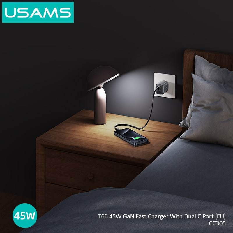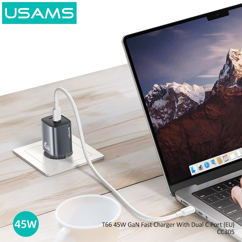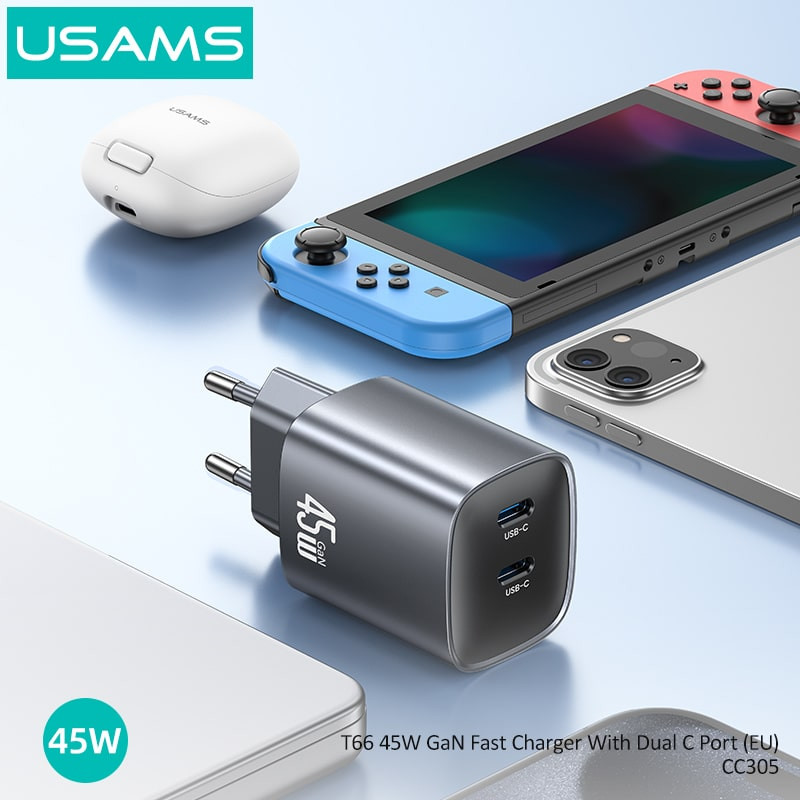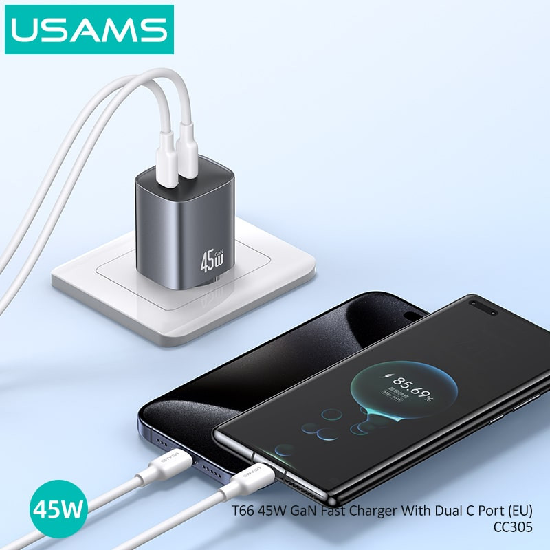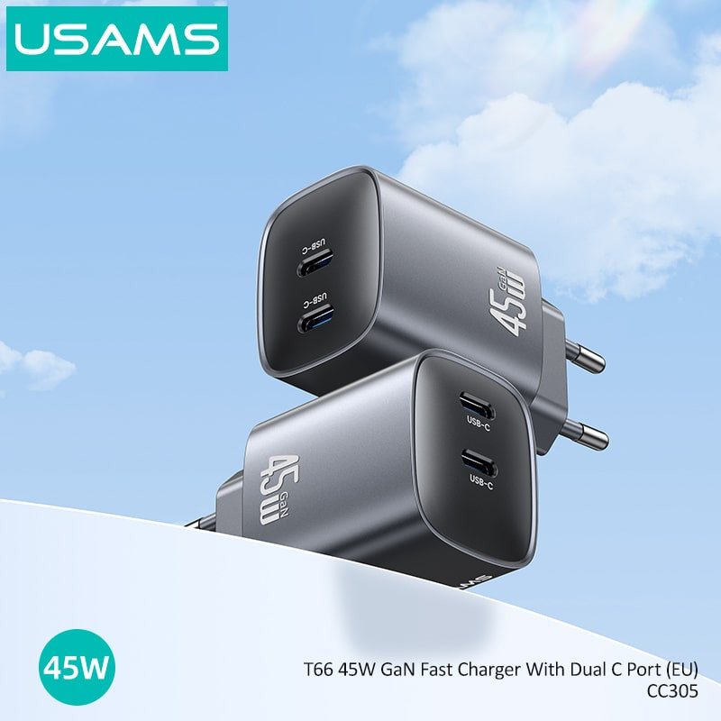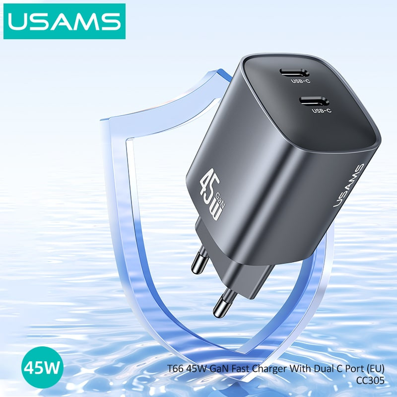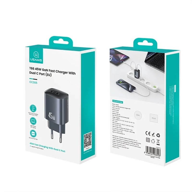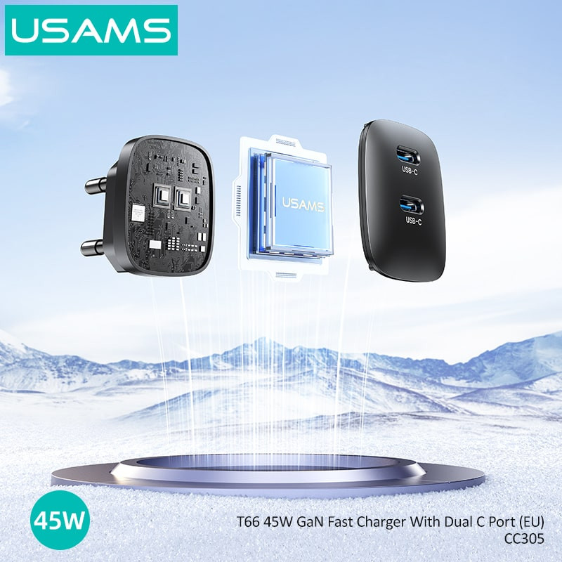 شارژر دیواری 45 وات دو پورت یوسمز مدل CC305 یک راهحل عالی برای شارژ سریع و ایمن انواع دستگاههای شماست. این شارژر با طراحی کوچک و ابعاد ۳۹ در ۳۳.۵ در ۴۴.۵ میلیمتر، به راحتی در کیف یا جیب شما جا میگیرد و همراهی ایدهآل برای سفر و استفاده روزمره است. وزن آن تنها ۸۶ گرم است و این ابعاد و وزن کم به لطف استفاده از تکنولوژی GaN امکانپذیر شده است. این فناوری به شارژر اجازه میدهد تا با ابعادی کوچکتر، توان بیشتری را ارائه دهد و در عین حال گرمای کمتری تولید کند.
