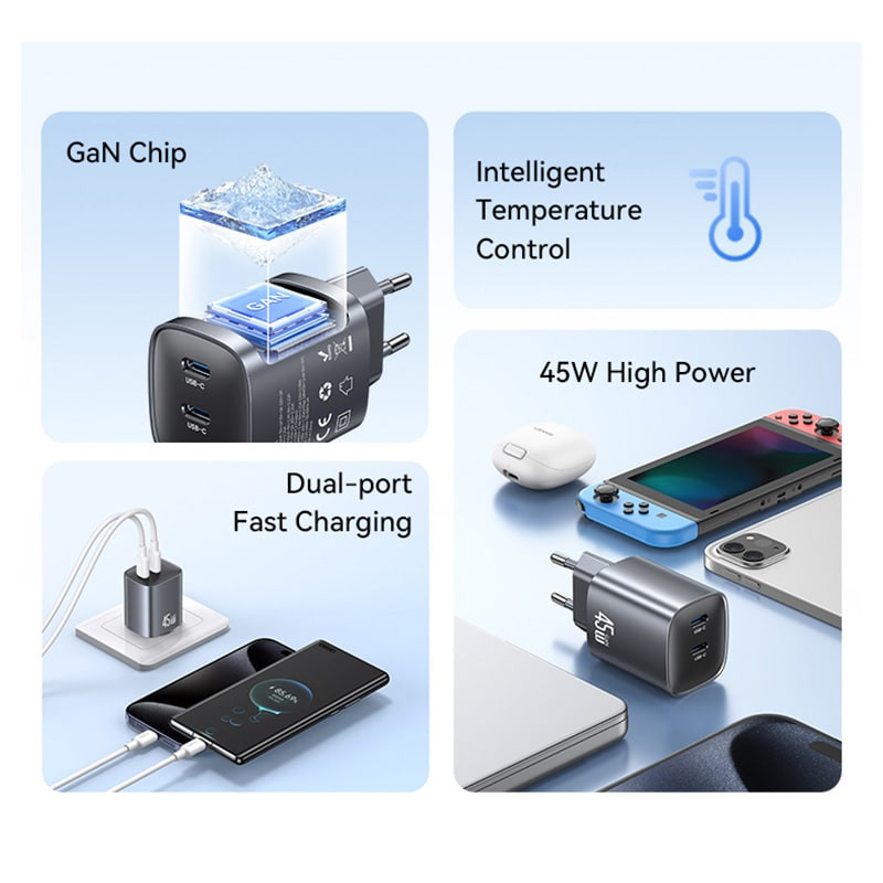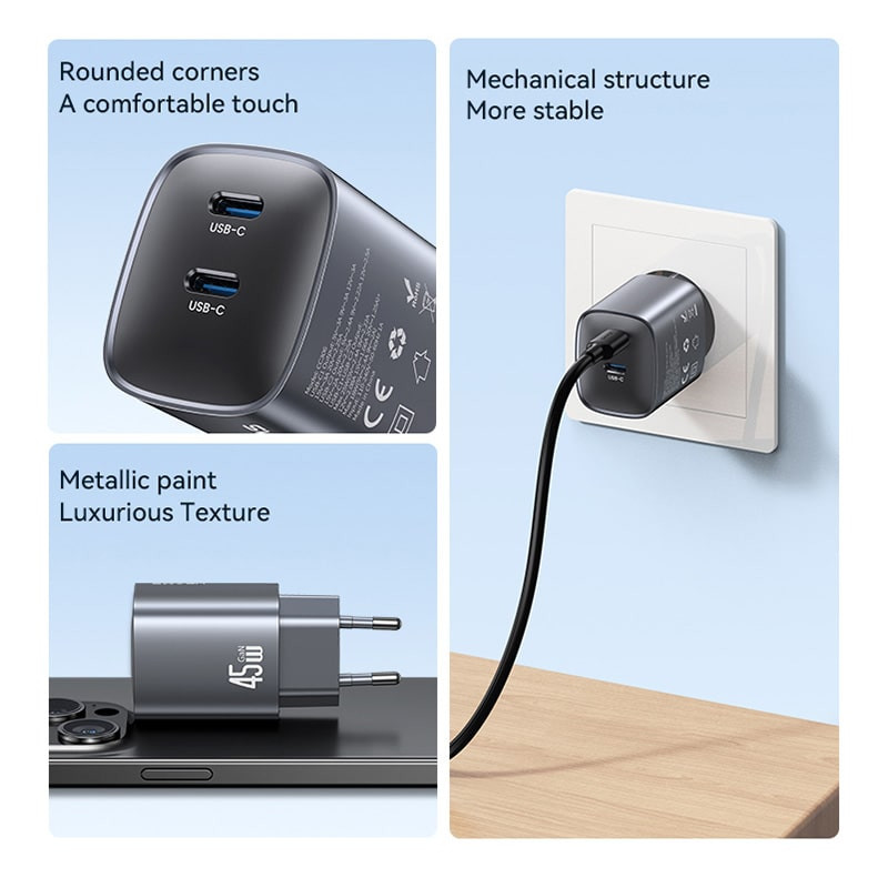 این شارژر دارای دو پورت تایپ سی است و میتواند به طور همزمان دو دستگاه را با حداکثر توان ۴۵ وات شارژ کند. این ویژگی برای افرادی که هم گوشی و هم نوتبوک خود را با پورت تایپ سی شارژ میکنند، بسیار کاربردی است. پشتیبانی از فناوریهای شارژ سریع و حداکثر جریان ۳ آمپر، باعث میشود دستگاههای شما در سریعترین زمان ممکن آماده استفاده شوند.