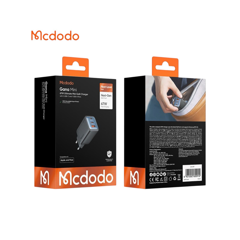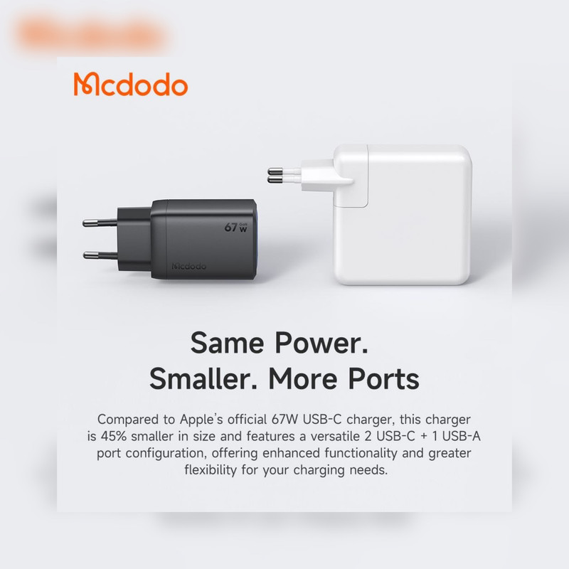 شارژر Mcdodo CH-097 ترکیبی از قدرت، فناوری نوین و طراحی مینیمال است. توان بالای 67 وات، فناوری GaN، سه درگاه خروجی و پشتیبانی از شارژ سریع باعث شده تا این محصول برای کاربران حرفهای و کسانی که به شارژ همزمان چند دستگاه نیاز دارند، انتخابی ایدهآل باشد