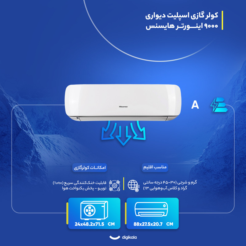 کولر گازی مدل «HIH-09TG» از محصولات باکیفیت و کاربردی ساخت شرکت «هایسنس» است. این دستگاه از دستهی کولرهای گازی اسپلیت بوده و با برخورداری از دو عملکرد سرمایش و گرمایش و ظرفیت 9000 در تمام فصول قابلاستفاده است. کمپرسور این اسپلیت از نوع اینورتردار بوده و این موضوع کمک شایانی به کیفیت عملکرد دستگاه کرده است. کمپرسورهای کولر گازی از نظر نوع عملکرد میتوانند دور ثابت یا دور متغیر(اینورتر) باشند و عملکرد اینورتر منجر به صرفهجویی در مصرف انرژی خواهد شد. دستگاهHIH-09TG مانند تمامی کولرگازیهای اسپلیت دو قسمت داخلی و خارجی دارد. قسمت خارجی وظیفهی خنککردن گاز را برعهده دارد که بیرون اتاق یا سالن و در فضای باز نصب میشود. این قسمت بدنهی فلزی دارد و باید روی پایههای مخصوص نصب شود. این یونیت با اتصالات و لولهها به پنل داخلی مرتبط میشود. پنل داخلی طراحی زیبایی دارد، داخل اتاق یا سالن نصب میشود و وظیفهی وزش باد خنک را ایفا میکند. کمپرسور این مدل از نوع روتاری است و با چرخش 360درجهی پروانه، هوا را با قدرت مکش و فشرده میکند و سپس با فشار زیاد از دریچهی خروجی بیرون میدهد. از دیگر خصوصیات کاربردی این مدل میتوان به بهرهمندی از حالت خواب، فیلتر قابلشستوشو و همچنین برخورداری از ریموت کنترل اشاره کرد.
