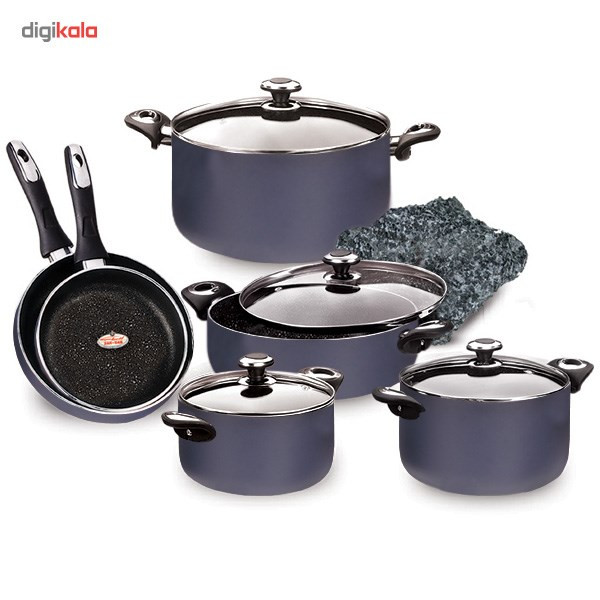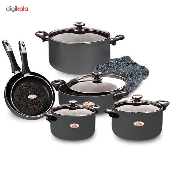 سرویس قابلمه گرانیتا مدل (GT-7500G) از شرکت زرساب است. سرویسهای آلومینیومی با وجود اینکه سالیان سال مورداستفادهی خانمهای خانه بوده، اما برای اینکه غذا بهسرعت ته میگرفت اکثراً محصول رضایت بخشی نبود. بنابراین اگر از انتقال سریع حرارت این جنس مرغوب بخواهیم بهرهی لازم را ببریم بهتر است روکشی از گرانیت را به آن اضافه کنیم تا دیگر نگران چسبیدن یا ته گرفتن غذا نباشیم. گرانیت مقاومت بسیار بالایی دارد و در این محصول از 5لایه آن برای پوشش بدنهی آلومینیومیاش استفادهشده است. همین مورد باعث شده تا به روغن کمتری نیاز داشته، و حرارت را در خود نگاه دارد. سرویس 10 پارچه گرانیتا شرکت زرساب مدل (GT-7500G) با 3 قابلمه به ابعاد 28، 24 و 20 به همراه در شیشهای، یک نیم قابلمه سایز 28 با در شیشهای و دو تابه سایز 24 و 20 به بازار عرضهشده است. جنسش از آلومینیوم و دارای روکش 5 لایه گرانیتی است و حرارت را بهطور یکسان به تمام ظرف پخش میکند. تابههای این سرویس بهصورت تک دسته طراحی شده و برای درپوش میتوان از درهای سایزهای مشابه قابلمهها استفاده کرد. دستگیرههای این سرویس از جنس باکالیت است، بنابراین مقاومت بالایی در برابر حرارت دارد. سرویس 10 پارچهی گرانیتا با برند زرساب مدل (GT-7500G) شامل 3 قابلمه، یک نیم قابلمه و 2 تابه از جنس آلومینیوم با 5 لایه روکش گرانیتی انتخاب مناسبی از محصول ایرانی باکیفیت بالا است.