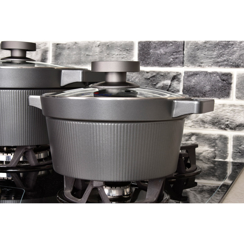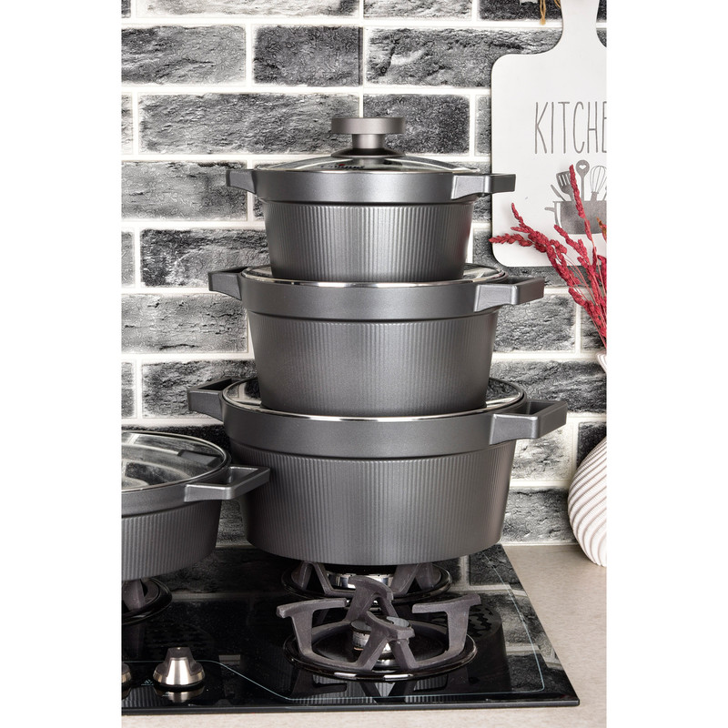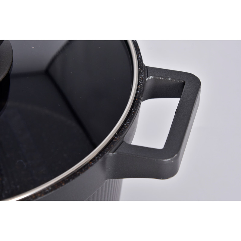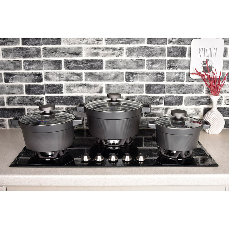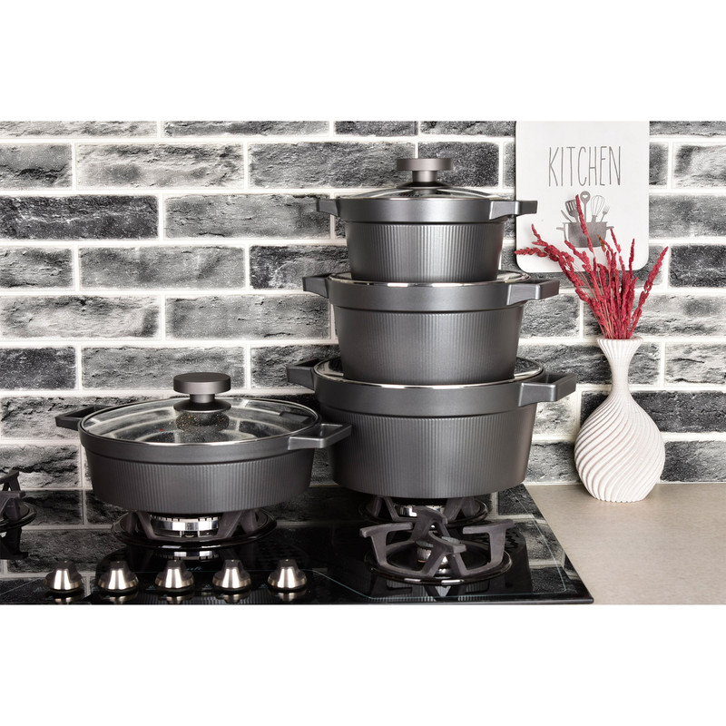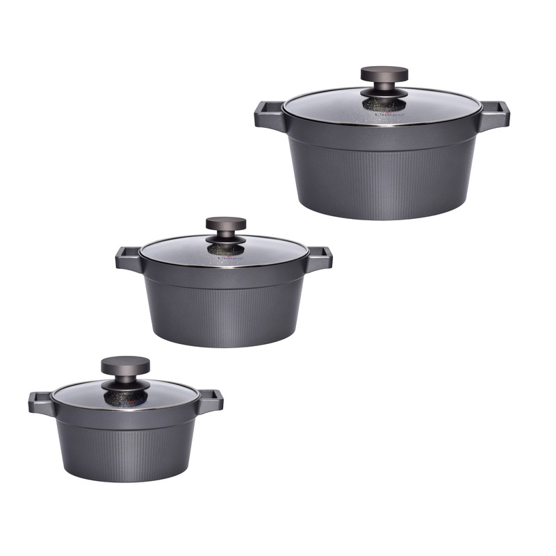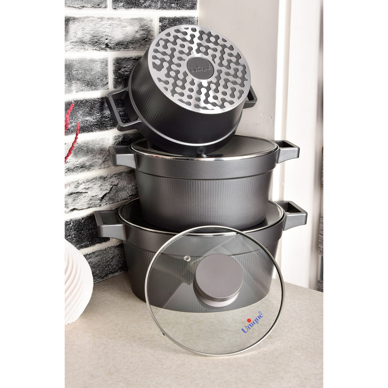 سرویس قابلمه یونیک دیاموند مشکی 8 پارچه یک سرویس شامل تابه، قابلمه است که نیاز های پخت و پز آشپزخانه شما را پوشش می دهد. دسته های قابلمه های این سرویس از جنس بدنه و با روکشی عایق حرارت و نسوز هستند. درب ها از شیشه با لبه لاستیکی هستندکه به خوبی روی ظرف کیپ میشوند.
