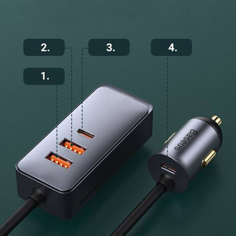 شارژر فندکی و هاب فست شارژ Baseus CCBT-A0G یک محصول کاربردی و تولید شده از بدنه ی خوش ساخت به جنس پلی کربنات و آلیاژ آلومینیوم است که مقاومت مناسبی در برابر حرارت، فشار و دیگر آسیب های احتمالی نشان می دهد. فندکی این دستگاه از ولتاژ ورودی 12 تا 24 ولت پشتیبانی می کند که مناسب برای استفاده در انواع خودرو می باشد و با توان خروجی کلی 120 وات عملیات شارژدهی دستگاه های مختلف را با عملکردی مطلوب مهیا می سازد. این محصول از یک هاب با مجموع دو پورت USB و یک پورت تایپ سی و فندکی دارای یک درگاه Type-C تشکیل شده که قابلیت شارژ همزمان 4 دستگاه با حداکثر شدت جریان 3 آمپر در ولتاژ 5 ولت را ارائه می دهد.