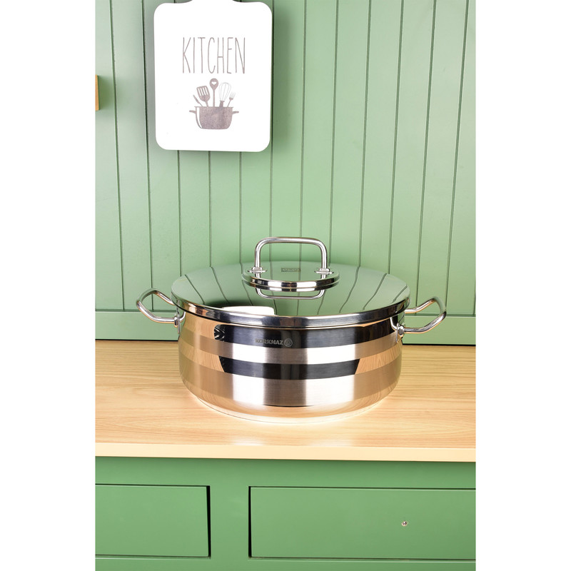 قابلمه استیل کرکماز مدل ASTRA2 A2038، یکی از محصولات برتر و باکیفیت برند کرکماز، غول صنعت لوازم خانگی ترکیه است. این برند که فعالیت خود را از سال ۱۹۸۵ آغاز کرده، امروزه به عنوان یکی از محبوبترین و موفقترین برندهای جهانی در حوزه لوازم آشپزخانه شناخته میشود. محصولات کرکماز نهتنها در ترکیه، بلکه در سراسر اروپا و جهان طرفداران فراوانی دارند. قابلمه استیل کد ASTRA2 A2038 نیز با طراحی زیبا، کیفیت ساخت عالی و عملکرد بینظیر، یکی از بهترین انتخابها برای علاقهمندان به آشپزی حرفهای و خانگی است .بدنه این محصول از فولاد ضد زنگ نیکل-کروم ساخته شده است که نهتنها مقاومت بالایی در برابر زنگزدگی و خراش دارد، بلکه در طول فرآیند تولید، صیقل فراوانی خورده تا سطحی درخشان و جذاب ایجاد کند. این ویژگی علاوه بر افزایش زیبایی ظاهری، باعث دوام و ماندگاری فوقالعاده محصول میشود. فولاد ضد زنگ بهکار رفته در این تابه، آن را به گزینهای ایدهآل برای پخت و پز روزمره و حتی مناسبتهای خاص تبدیل کرده است.