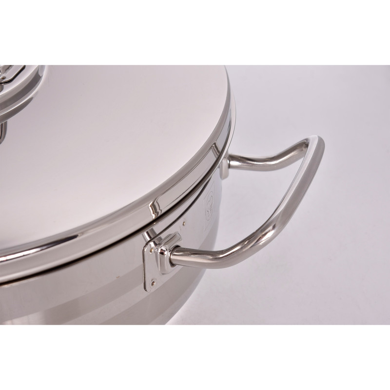 دستههای این قابلمه با طراحی ارگونومیک و کاربردی ساخته شدهاند تا حمل و جابجایی آن را حتی در شرایط داغ، آسان و ایمن کنند. این طراحی نهتنها به زیبایی ظاهری تابه افزوده است، بلکه استفاده طولانیمدت از آن را نیز راحتتر میکند. دستهها بهگونهای طراحی شدهاند که به راحتی در دست جای میگیرند و از لیز خوردن جلوگیری میکنند. این محصول دارای سایز 32 و گنجایش 10.25 لیتر است که مناسب خانواده های 8 الی 10 نفر می باشد