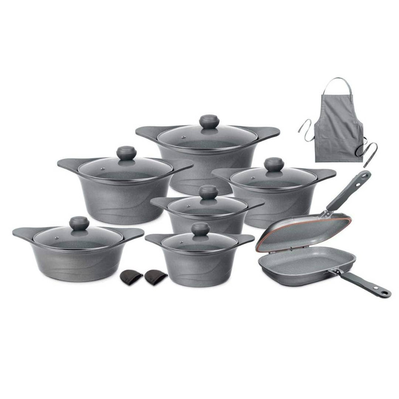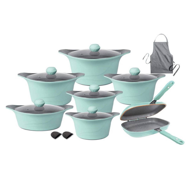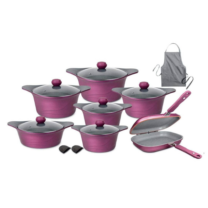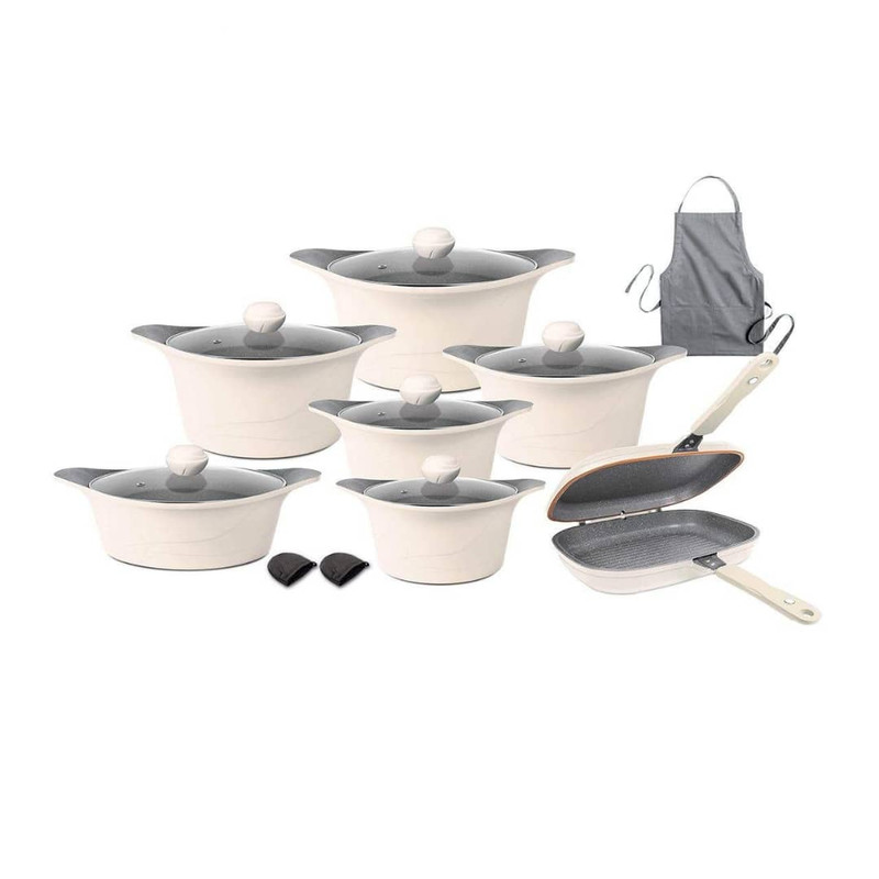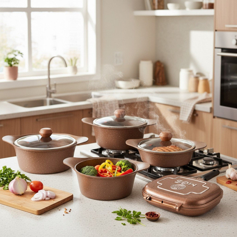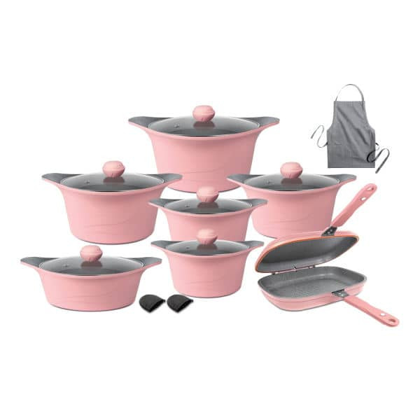 ترکیب اقلام سرویس شامل قابلمهها در سایزهای ۱۶، ۲۰، ۲۴، ۲۸ و ۳۲ سانتیمتر، به همراه تابه و لوازم جانبی مانند پیشبند و دستگیره، پاسخگوی تمام نیازهای پخت و پز خانگی است. طراحی دستهها با ساختار مقاوم و هماهنگ با بدنه، علاوه بر زیبایی، ایمنی و راحتی در استفاده را افزایش میدهد.