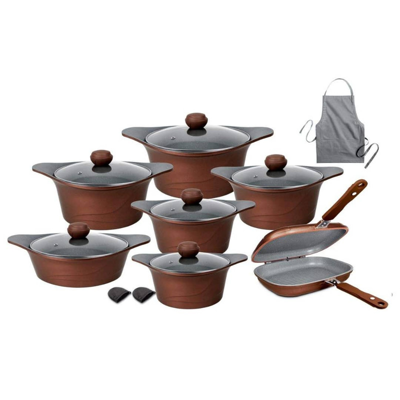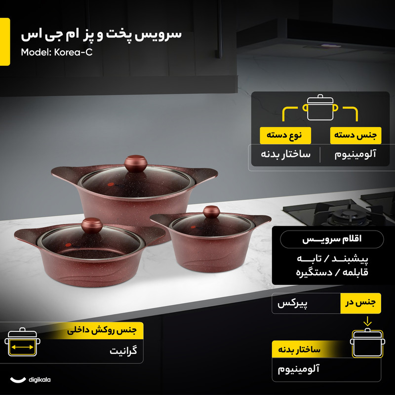 سرویس پخت و پز ۱۷ پارچه امجیاس مدل Korea-C مجموعهای کامل و زیبا برای آشپزخانههای مدرن است که عملکرد بالا را با دوام و طراحی هوشمندانه ترکیب کرده است. این سرویس قابلمه و تابه از آلومینیوم ساخته شده و با روکش داخلی گرانیت ضدخش (ماربل) پوشیده شده است تا علاوه بر پخت یکنواخت غذا، از چسبیدن مواد غذایی به سطح جلوگیری کند و شستوشو را آسانتر سازد.