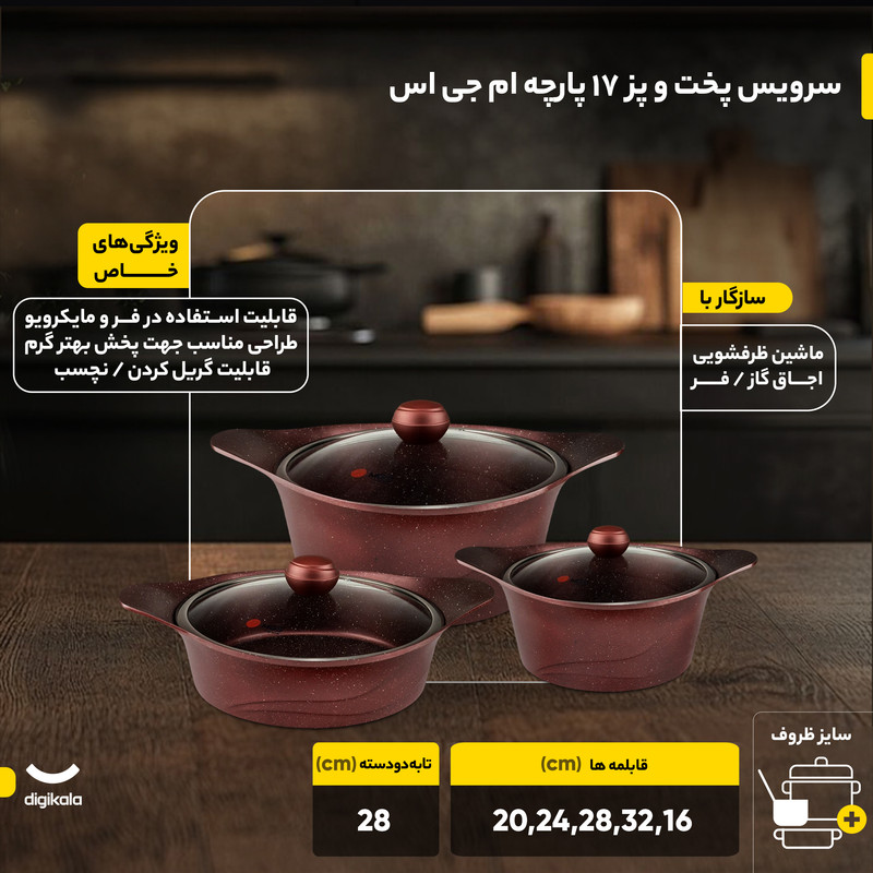 این محصول ساخت برند آلمانی MGS است که تولید آن در ایران و تحت نظارت مستقیم شرکت اصلی انجام میشود. سازگاری با فر، اجاق گاز و ماشین ظرفشویی باعث شده تا این سرویس، گزینهای کاربردی و بادوام برای استفادهی روزمره باشد. از میان ویژگیهای خاص آن میتوان به قابلیت گریل کردن، استفاده در فر و مایکروویو، طراحی مناسب برای پخش یکنواخت گرما و مقاومت حرارتی تا ۲۶۰ درجه سانتیگراد اشاره کرد. این مجموعه انتخابی ایدهآل برای کسانی است که کیفیت، دوام و زیبایی را همزمان میخواهند.
