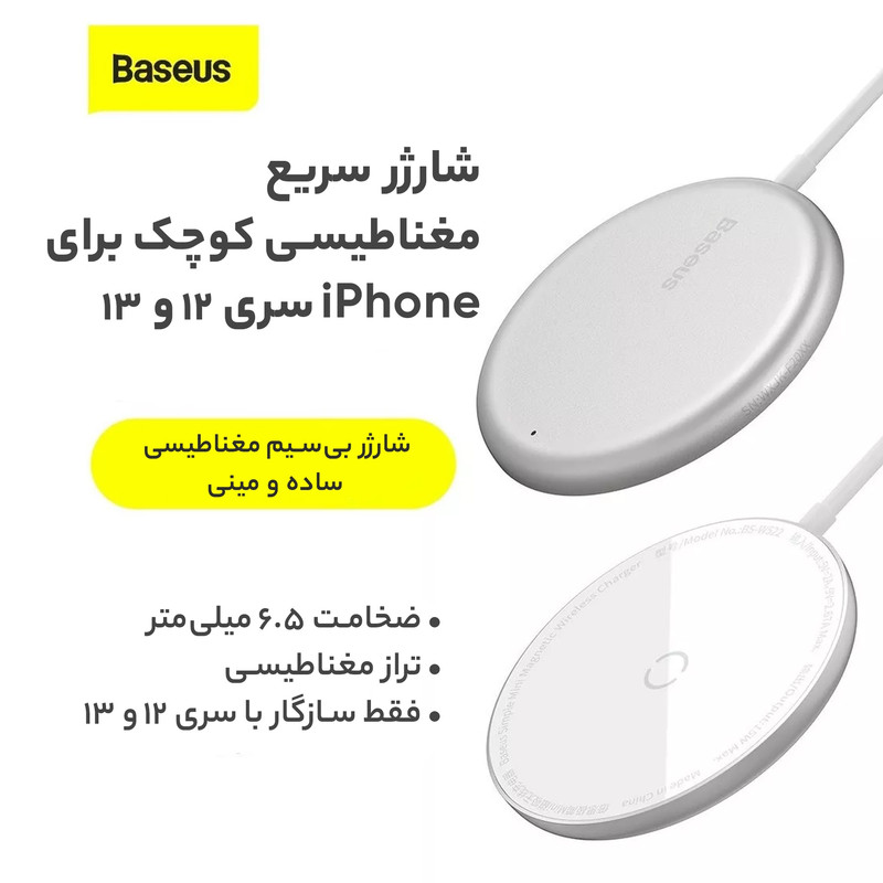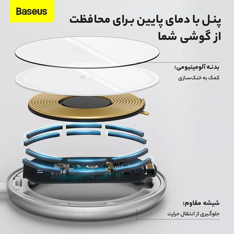 شارژر وایرلس مگنتی بیسوس سازگار با سری 12 آیفون اپل و سایر گوشیهای هوشمند دیگر مجهز به فناوری Qi، طراحی مگنتی: مجهز به حلقه مغناطیسی که به بدنه آیفون 12 میچسبند و از هدر رفت انرژی جلوگیری میکنند؛ دیگر نیازی نیست نگران باشید که آیا گوشی خود را به درستی روی شارژر وایرلس گذاشتهاید یا نه!، چرا که به طور خودکار و با توجه به خاصیت مگنتی شارژر وایرلس، تلفن همراه و آهنربا در جای درستی قرار میگیرد. شارژ سریع با حداکثر توان خروجی 15 وات کاملا سازگار با سری 12 آیفون اپل، قابلیت شارژ سریع سایر گوشیهای هوشمند دیگر مجهز به فناوری Qi با توانهای خروجی 2.5، 5، 7.5 و 10، شارژ ایمن: محافظت از تغییرات شدت جریان، ولتاژ اضافی، شارژ بیش از حد، تخلیه شارژ بیش از حد، گرم شدن بیش از حد، اتصال کوتاه و تداخل الکترومغناطیسی، قابلیت تشخیص خودکار اجسام فلزی خارجی FOD جهت ایمن سازی و جلوگیری از بروز خطرات، مجهز به یک چراغ LED جهت نشان دادن وضعیت شارژ دستگاه، تامین انرژی مورد نیاز دستگاه از طریق کابل تایپ سی 1.5 متری موجود در بسته بندی محصول (ورودی: 5V/2A, 9V/2.67A)، دارای ضخامت بسیار کم برابر با 6.5 میلیمتر، شارژر وایرلس بیسوس در مقایسه با سایر شارژرهای بیسیم، حدود 50 درصد کوچکتر و حدود 20 درصد باریکتر است؛ بدنه شارژر از آلیاژ آلومینیوم، گلس و TPE ساخته شده است و مجموع این مواد به کار رفته در ساخت شارژر بی سیم کمک میکنند تا دمای دستگاه بالا نرود و آسیبی به باتری و خود شارژر وارد نیاورد.