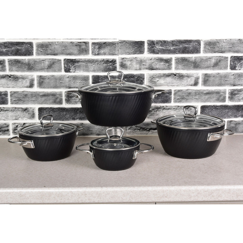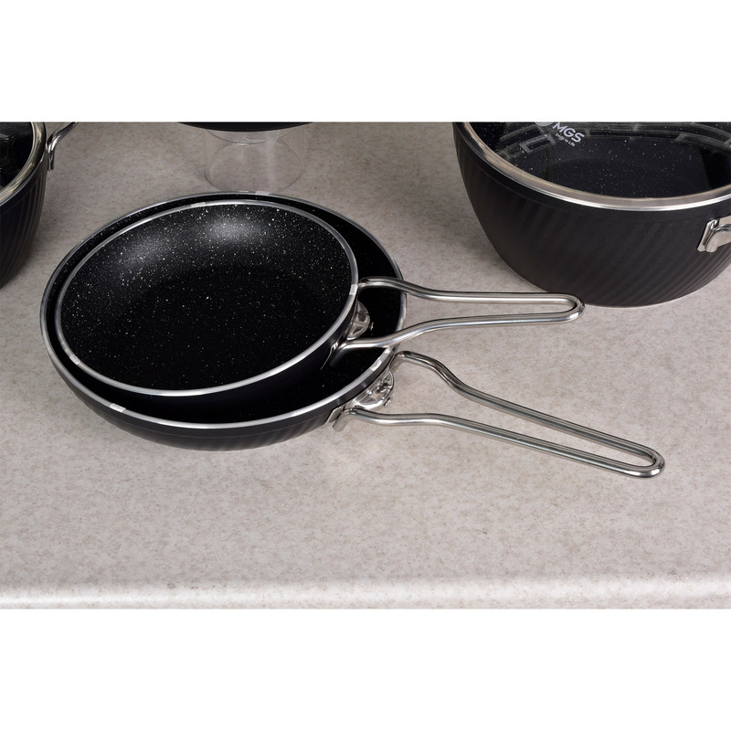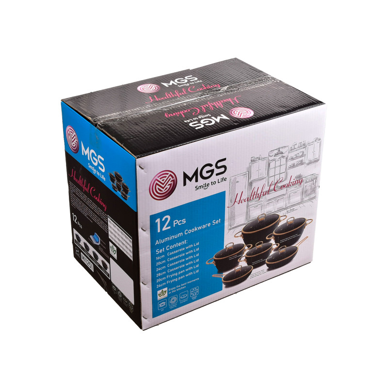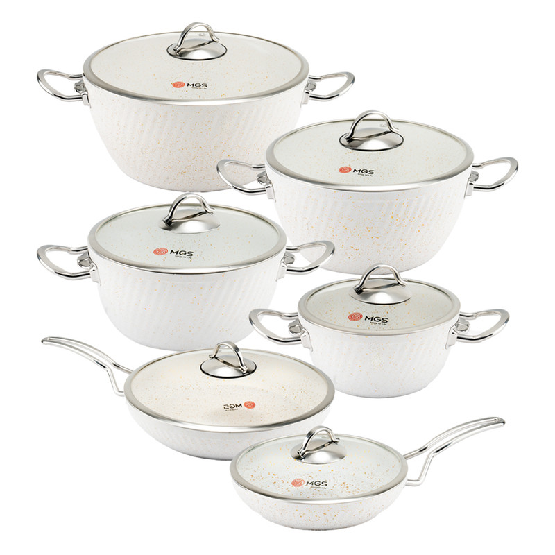 این سرویس قابلمه 12 پارچه طرح ماینز شامل چهار قابلمه و چهار درب پیرکس بعلاوه دو تابه تک دسته همراه درب است. جنس روکش این ست، گرانیت نچسب است. نحوه ساخت این سرویس قابلمه 12 پارچه فورج و دستههای آن به بدنه متصل شده است.