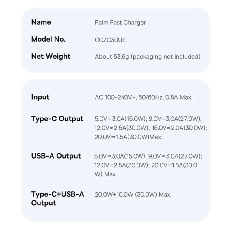 شارژر دیواری 30 وات بیسوس مدل Palm Fast Charger 30W به همراه کابل تبدیل تایپ سی :