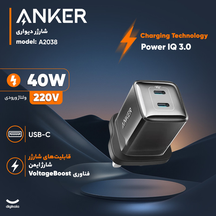شارژر دیواری ۴۰ وات انکر مدل A2038 یک شارژر پیشرفته و مطمئن برای گوشیهای هوشمند، تبلتها و لپتاپهای کوچک است که با طراحی جمعوجور و امکانات هوشمند، تجربه شارژ سریع و ایمن را برای کاربران فراهم میکند. این شارژر با وزن ۸۵ گرم و بدنهای از جنس پلاستیک مقاوم ساخته شده و اتصال آن به برق از طریق سهپین استاندارد انجام میشود، که استفاده راحت در خانه، محل کار و سفر را ممکن میسازد.