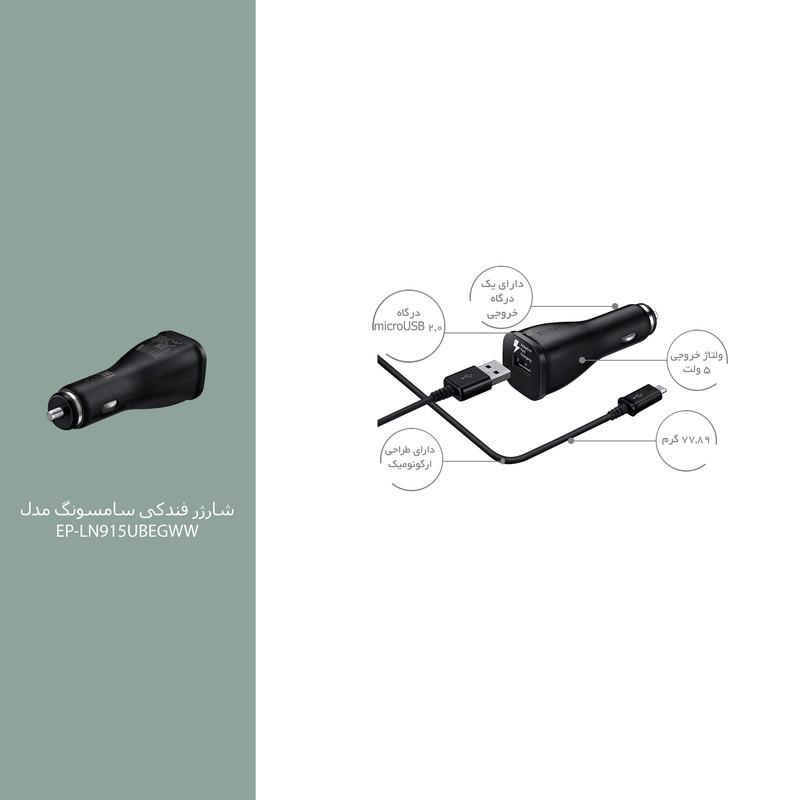 شارژر فندکی «سامسونگ» (Samsung) مدل « EP-LN915UBEGWW» ابزاری کوچک ولی کارآمد است که جریان لازم را برای شارژ گوشی موبایل درون خودرو فراهم میکند. با توجه به وابستگی هرچه بیشتر افراد به گوشیهای موبایل، تمامشدن شارژ گوشی از مواردی است که باعث نگرانی میشود. چه افرادی که برای کارهایشان به برنامههای نصبشده روی گوشی وابستهاند و چه افرادی که لازم است همواره در دسترس و آمادهی دریافت تماس باشند. اگر در حال سفر یا رفتوآمد با اتومبیل هستید و به پریز برق برای استفاده از شارژرهای دیواری دسترسی ندارید، شارژرهای فندکی کمک بزرگی هستند. این شارژرها با ابعاد کوچکشان به محل فندک خودرو متصل میشوند و جریان لازم را برای شارژ گوشی فراهم میکنند. شارژر فندکی سامسونگ، سبک و کوچک است. برق 12 تا 24 ولت خودرو پس از عبور از این شارژر به ولتاژ 5 ولت میرسد که برای شارژکردن اکثر دستگاههای دیجیتال مناسب است. شدتجریان خروجی کلی در این محصول 2.0 آمپر است. گفتنی است همراه این محصول یک کابل microUSB عرضه شده است که طول 1.2 متری دارد و ارزش خرید بالایی را به همراه میآورد.