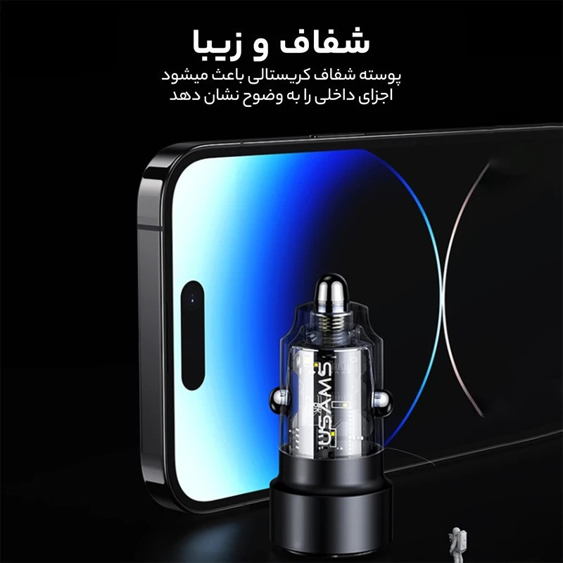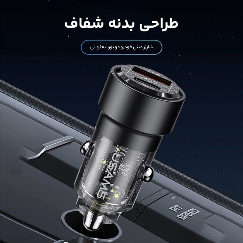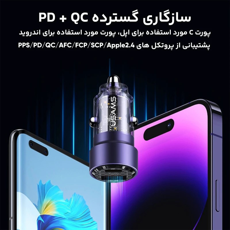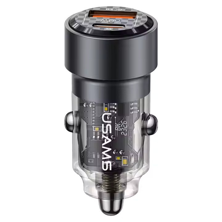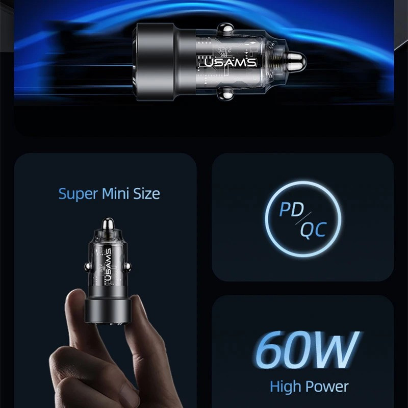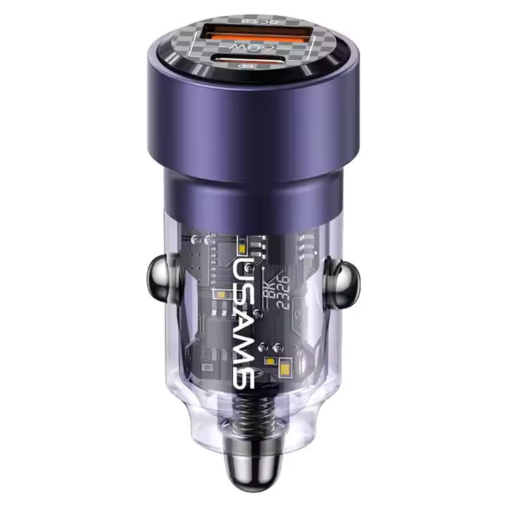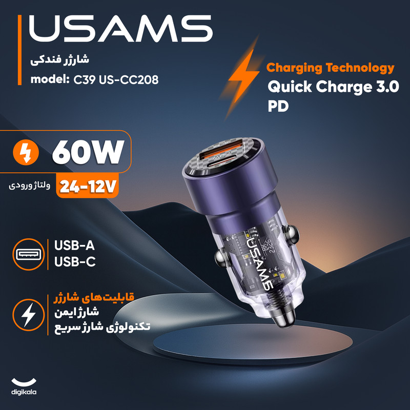 شارژر فندکی usams مدل CC208 دارای یک پورت USB و یک پورت Typec میباشد. این شارژر فندکی محصولی از شرکت یوسمز بوده که از خاموش شدن گوشی شما در اتومبیل جلوگیری میکند و به شما این امکان را میدهد تا بتوانید دو گوشی موبایل را به طور همزمان شارژ کنید. یکی دیگر از مزیتهای این فندکی ابعاد و نوع طراحی آن میباشد، این شارژر فندکی با ابعاد 24.5x24.5x48.6 میلیمتری خود سایز کوچکی دارد و با طراحی شفافی که دارد به زیبایی این شارژر فندکی افزوده است. با استفاده از شارژر فندکی usams میتوانیم به راحتی دو گوشی موبایل را به طور همزمان شارژ کنیم و این را مدیون دو پورت خروجی این شارژر فندکی هستیم که یکی از آن ها درگاه خروجی USB و دیگری درگاه Type-C است. فندکی CC208 یوسمز با مجموع توان خروجی حداکثر 60 واتی خود، میتواند از شارژ گوشیهایی که قابلیت سوپر فست شارژ را دارند، پشتیبانی کرده و آن ها را نیز شارژ نماید. در این رابطه باید به این نکته نیز توجه داشته باشید که شدت جریان و ولتاژ پورت USB برابر است با (5V/3A – 9V/3A 12V/2.5A) و شدت جریان و ولتاژ خروجی از درگاه تایپ سی شارژر فندکی هم برابر با (5V/3A – 9V/3A – 12V/2.5A) است که هنگام استفاده از هر دوی پورتها، مجموعاً 60 وات خروجی کلی شارژر فندکی را تشکیل می دهند که هر کدام به صورت مجزا حداکثر 30 وات خروجی می دهد. جنس بدنه این محصول از ترکیب آلیاژ آلومینیوم و PC است که مقاومت آن را در برابر خراش و همچنین ضربه و فشار کمی بیشتر میکند، علاوه بر این، باعث افزایش بیش از حد دما نیز نمیشود. همچنین در تکمیل توضیحات آن باید به این نکته نیز توجه داشت که خود شارژر فندکی در برابر حرارت مقاوم است. این شارژر فندکی از فناوری شارژ سریع PD و QC پشتیبانی میکند.