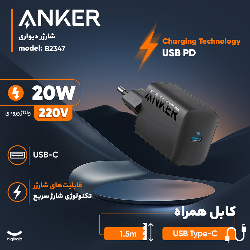 شارژر دیواری 20 وات انکر مدل B2347 به همراه کابل USB-C به طول 1.5 متر
