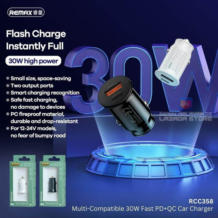 شارژر فندکی30وات ریمکس مدل RCC358-30W-PD+QC فست شارژ یکی از جدید مدلهای تولیدی توسط این برند می باشد که از تکنولوژی PD و QC برخوردار است و دارای دو پورت خروجی می باشد (یک USB و یک TYPE C) که خروجی تایپ سی آن 30 وات و خروجی USB آن 22.5 وات می باشد. این شارژر با ولتاژ 12 تا 24 ولت کار می کند که مناسبل استفاده در وسایل نقلیه سبک و سنگین می باشد.