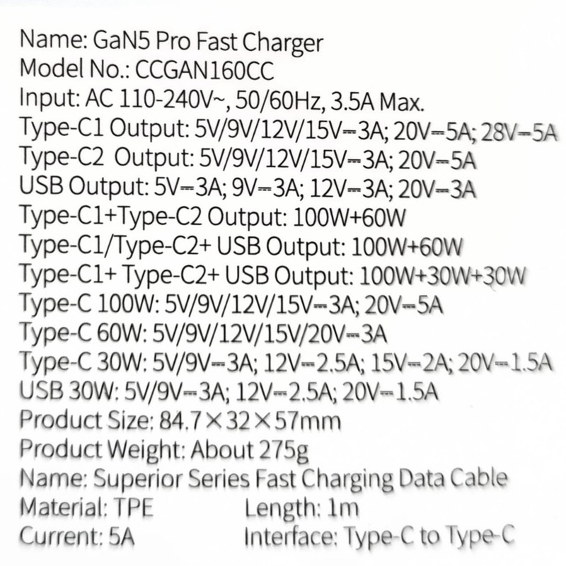 شارژر دیواری GaN5 بیسوس دارای 3 پورت ورودی است که دو پورت آن Type-C و یک پورت USB بوده و شما میتوانید 3 دستگاه را به طور همزمان به شارژر متصل کنید و از شارژ سریع بهرهمند شوید. این شارژر پرطرفدار میتواند ولتاژ ورودی AC 110-240V~, 50/60Hz, 3.5A Max را پشتیبانی کند و دستگاههای متصل، با شدت جریان حداکثر 160 وات میتوانند نیرو دریافت کنند. این تقسیم نیرو به صورت زیر است: